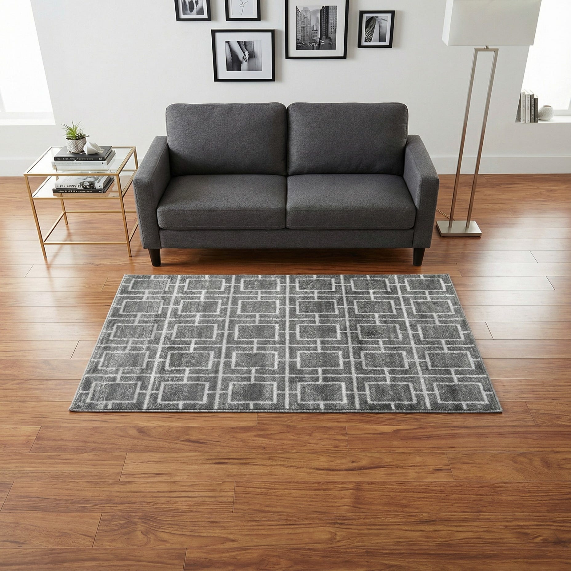 This rug works well in contemporary and transitional interiors—place it in an entryway to anchor a minimal vignette, layer it beneath a small seating group or nightstand for added polish, or use it in a home office to introduce pattern without overwhelming the room. Its gray-silver palette coordinates easily with chrome, glass, mirrored furniture and neutral upholstery, and pairs nicely with charcoal, white or soft metallic accents for a cohesive, modern look.
