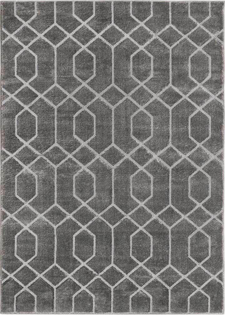 A clean, modern trellis of interlocking elongated hexagons is outlined in Silver against a Gray Silver background, creating a crisp geometric repeat with subtle dimensional interest. The pattern is achieved through a slightly higher pile for the trellis lines and a lower, velvety field, so the surface has a gentle sheen and a tactile contrast when you run your hand across it. The yarn blend gives a soft, smooth feel underfoot while holding the pattern definition clearly.