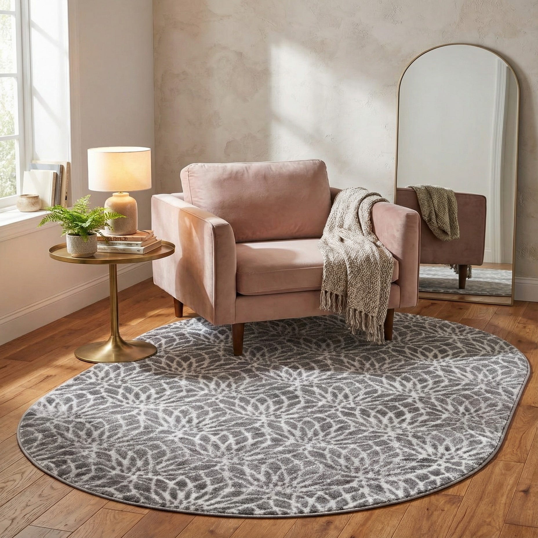 A soft, oval rug with a repeating trellis-inspired floral motif in crisp white set against a Gray Silver ground. The pattern’s overlapping petal shapes form a gentle lattice that gives the surface visual movement without overwhelming a room, making it a calm, modern take on classic trellis styling. The neutral Gray Silver background pairs cleanly with the light pattern for a tone-on-tone look that complements both cool and warm palettes.