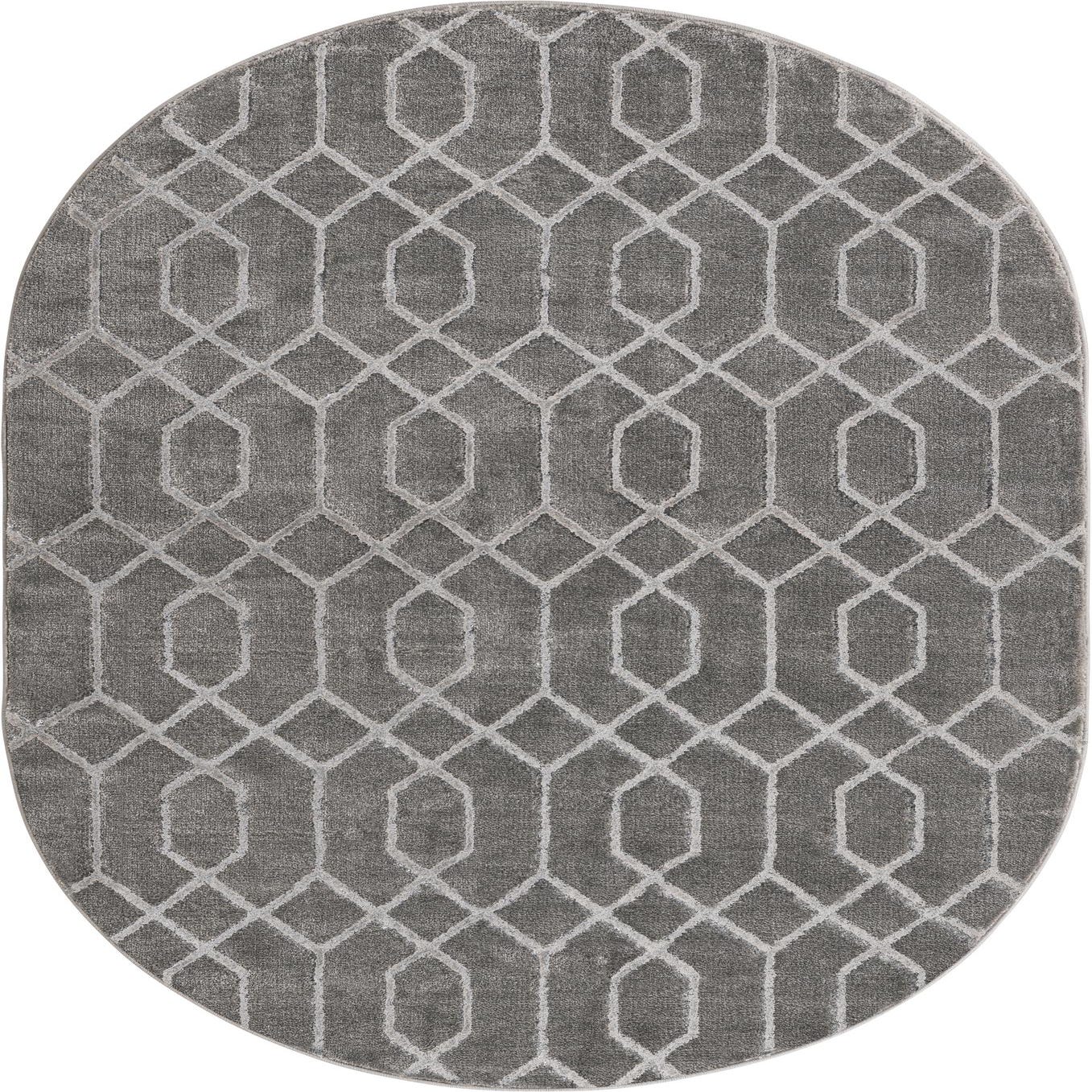 The oval silhouette makes this piece especially useful in entryways, under a small round dining set, in front of a vanity, or layered at the foot of a bed. Its cool gray-silver palette pairs well with contemporary and modern-glam interiors—think chrome or brushed-nickel accents, mirrored furniture, velvet upholstery—or with transitional rooms that mix traditional shapes and updated finishes. Pair it with navy, white, or soft blush accents for a balanced, sophisticated look.