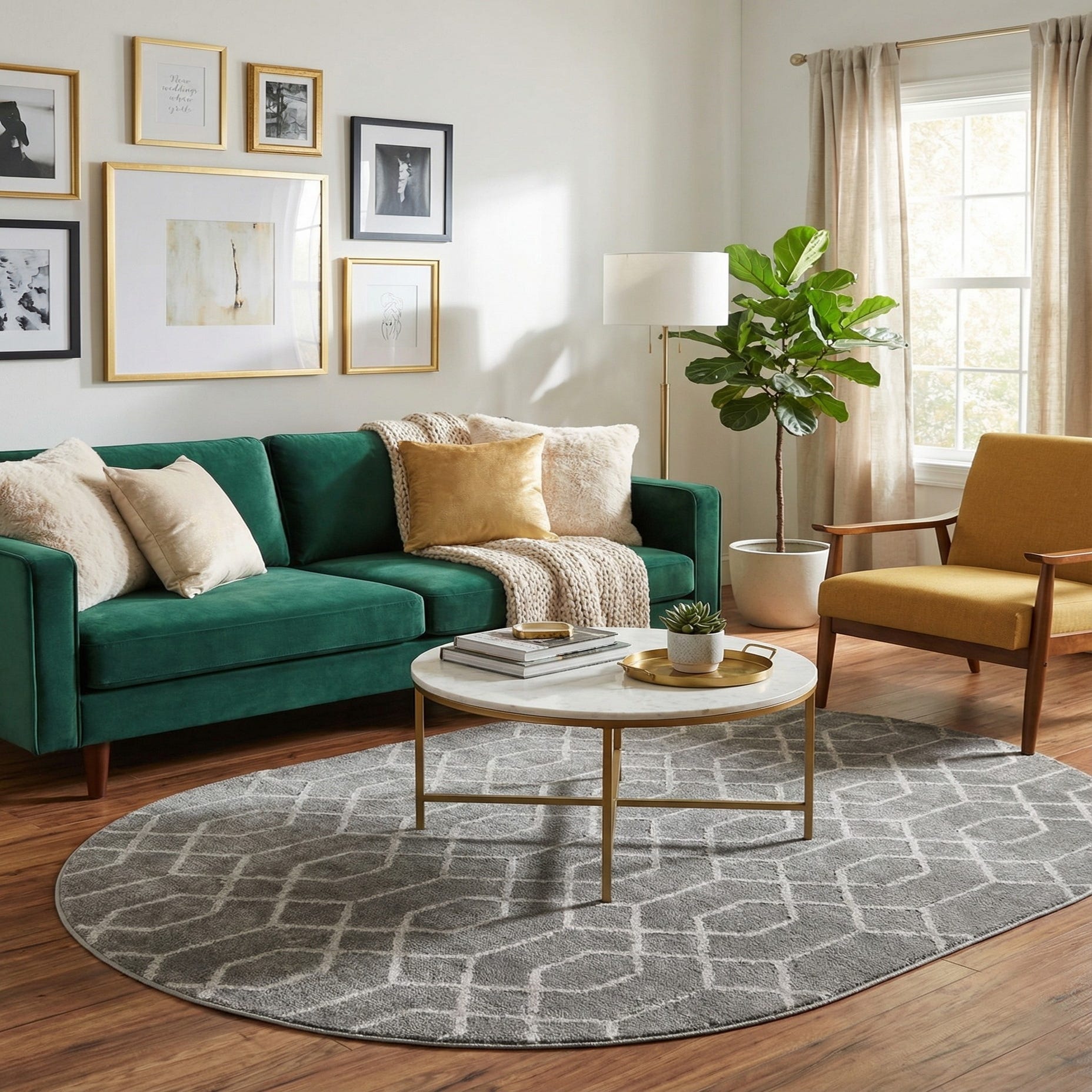 The oval silhouette makes this piece especially useful in entryways, under a small round dining set, in front of a vanity, or layered at the foot of a bed. Its cool gray-silver palette pairs well with contemporary and modern-glam interiors—think chrome or brushed-nickel accents, mirrored furniture, velvet upholstery—or with transitional rooms that mix traditional shapes and updated finishes. Pair it with navy, white, or soft blush accents for a balanced, sophisticated look.