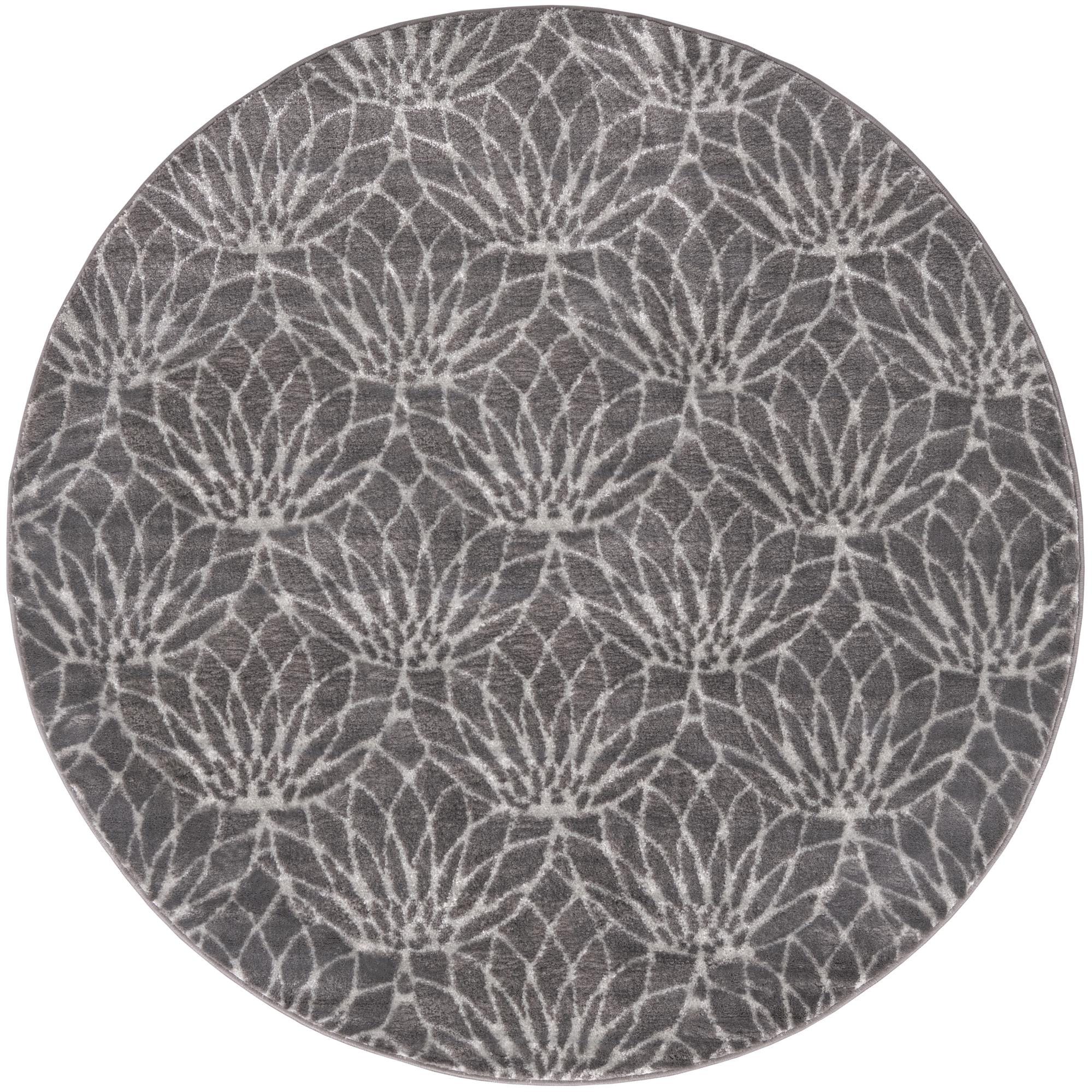 A 5' 3 round gray rug featuring a textured Hollywood Glam floral pattern in lighter gray and silver tones.