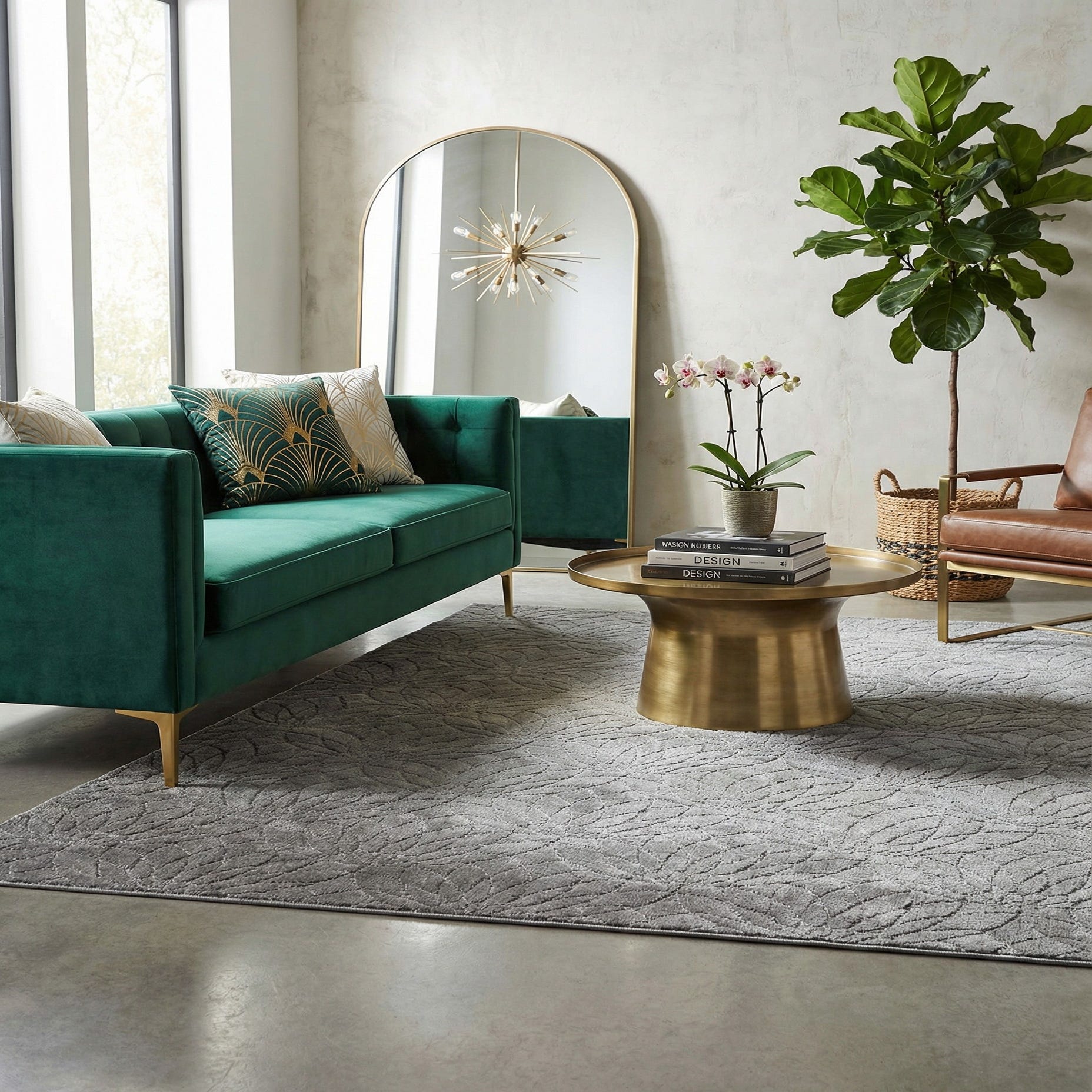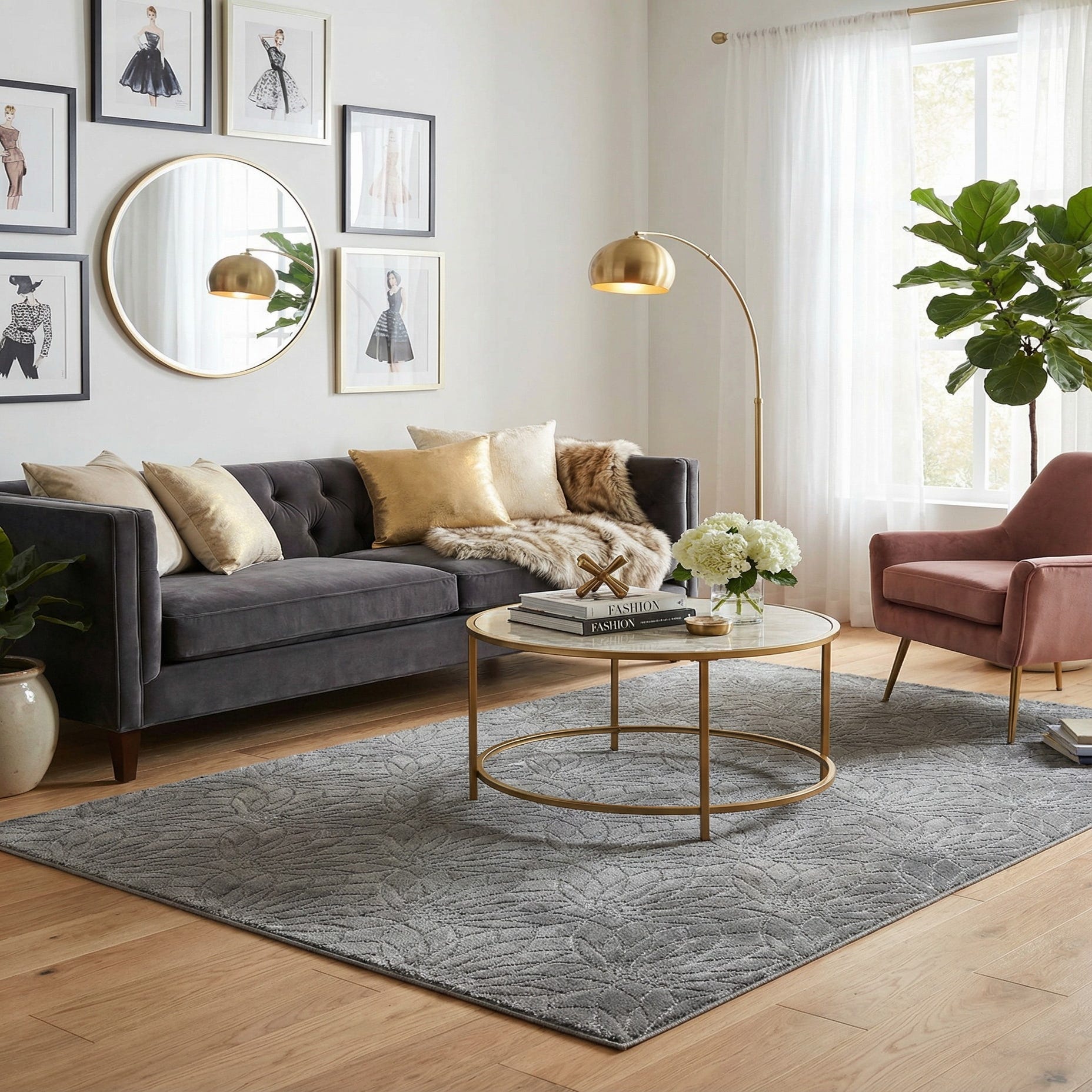 This rug works well in modern-glam and contemporary transitional interiors where a restrained metallic touch and soft texture are desired. Place it beneath a seating group to anchor neutral upholstery and mirrored or chrome accents, layer it under the lower two-thirds of a bed to add quiet shimmer to a bedroom, or use it in a home office or entry to introduce pattern without dominating the room. Pair with soft neutrals, charcoal, or deep navy for contrast, and add glass or metallic accessories to reinforce the rug’s subtle reflective character.