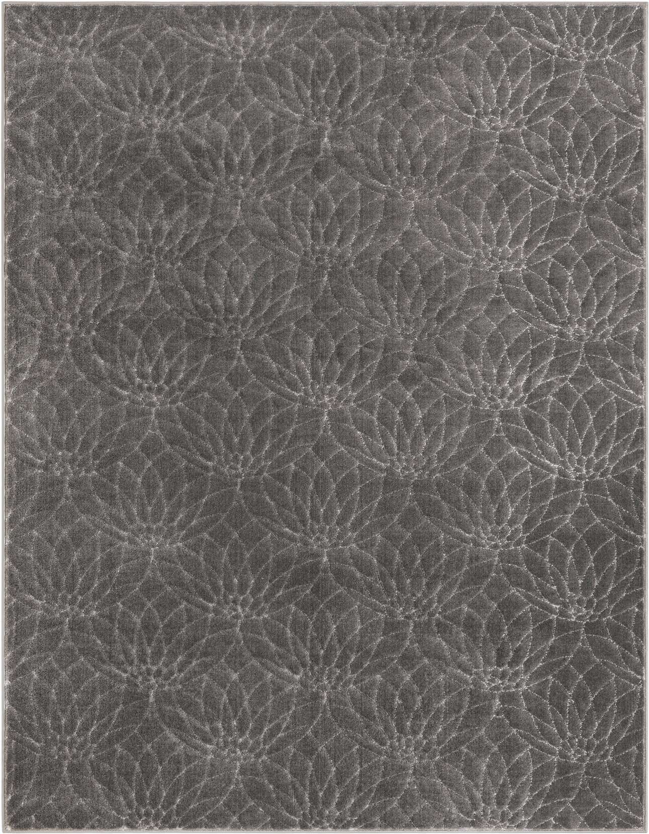 A refined trellis of overlapping petal motifs covers a Gray Silver field, with silver highlights tracing each motif to create soft contrast and subtle movement across the surface. Machine-made from 70% polypropylene and 30% polyester, the rug has a low, dense pile that feels smooth underfoot; the slightly shinier silver fibers that outline the pattern give a gentle sheen and a tactile, dimensional quality without adding bulk.
