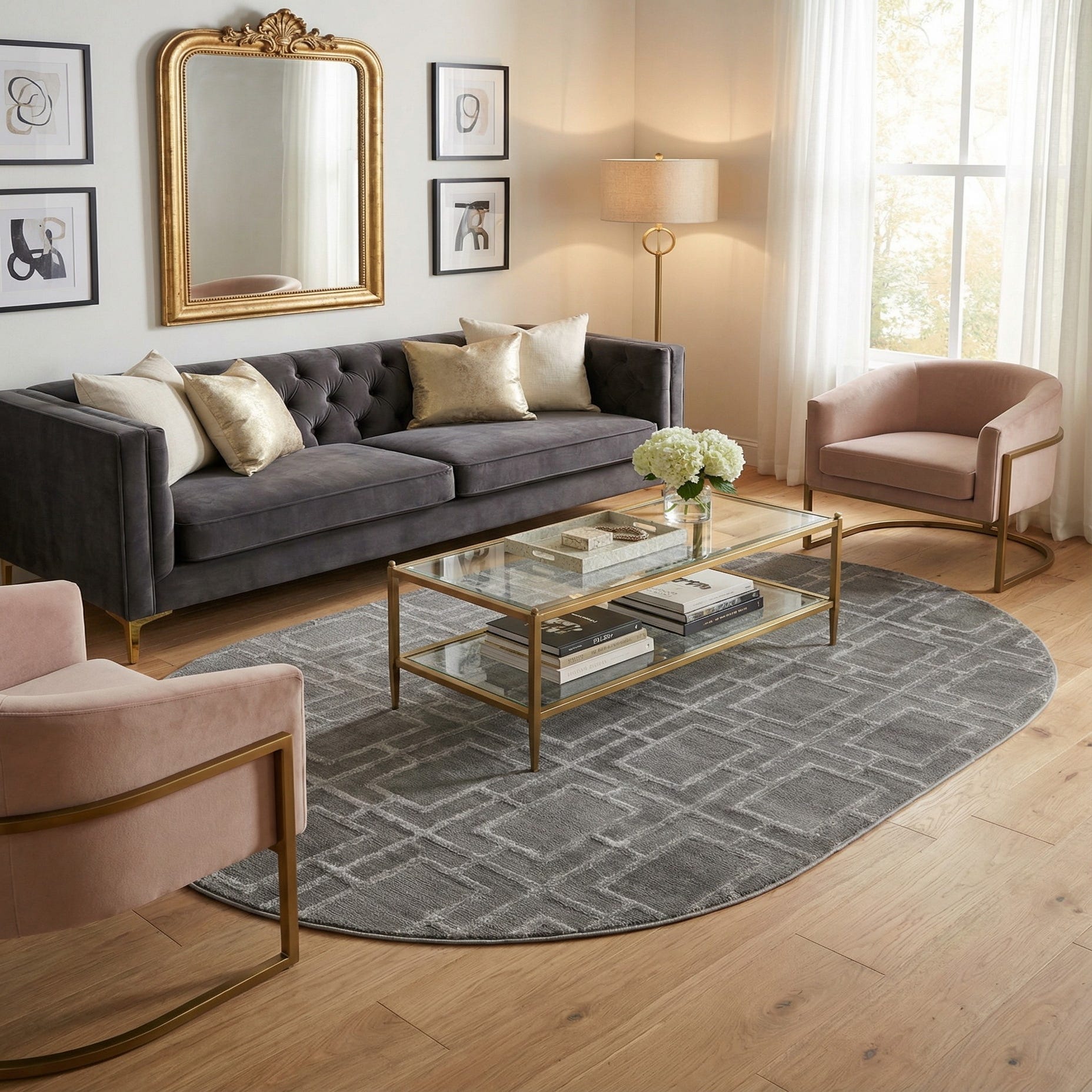 The oval shape and contemporary trellis pattern work well in modern, transitional, or glam-inspired interiors. Use it under a round dining table, to define a seating area in a living room, or at the foot of a bed to soften angular furniture lines. Pair with chrome or mirrored accents, pale woods, and neutral upholstery for a streamlined look, or layer with textured throw pillows and metallic accessories to add depth and subtle sparkle.