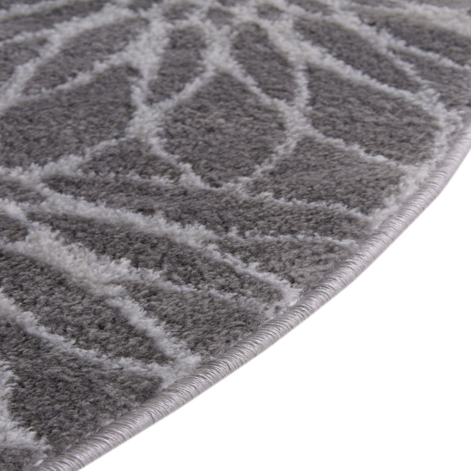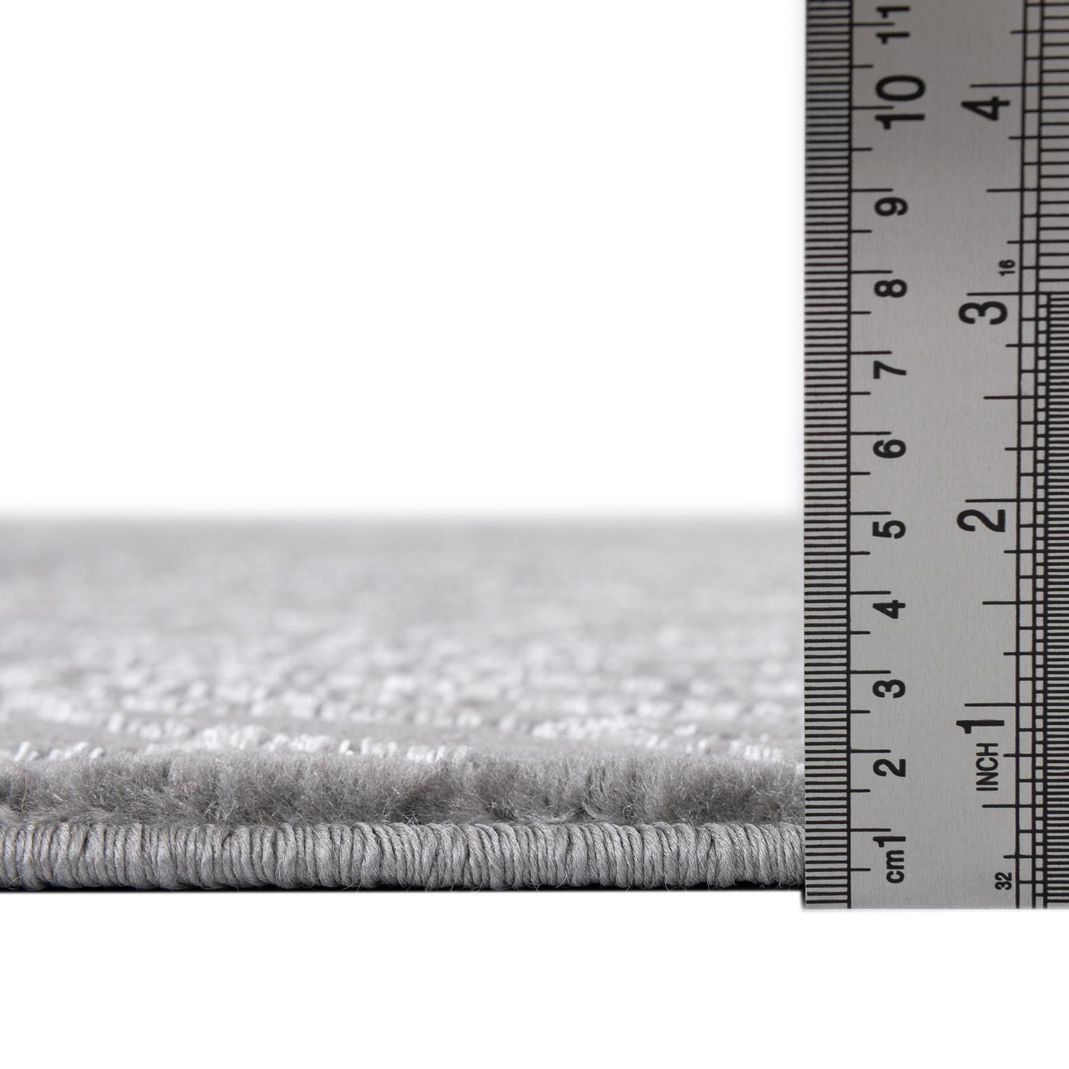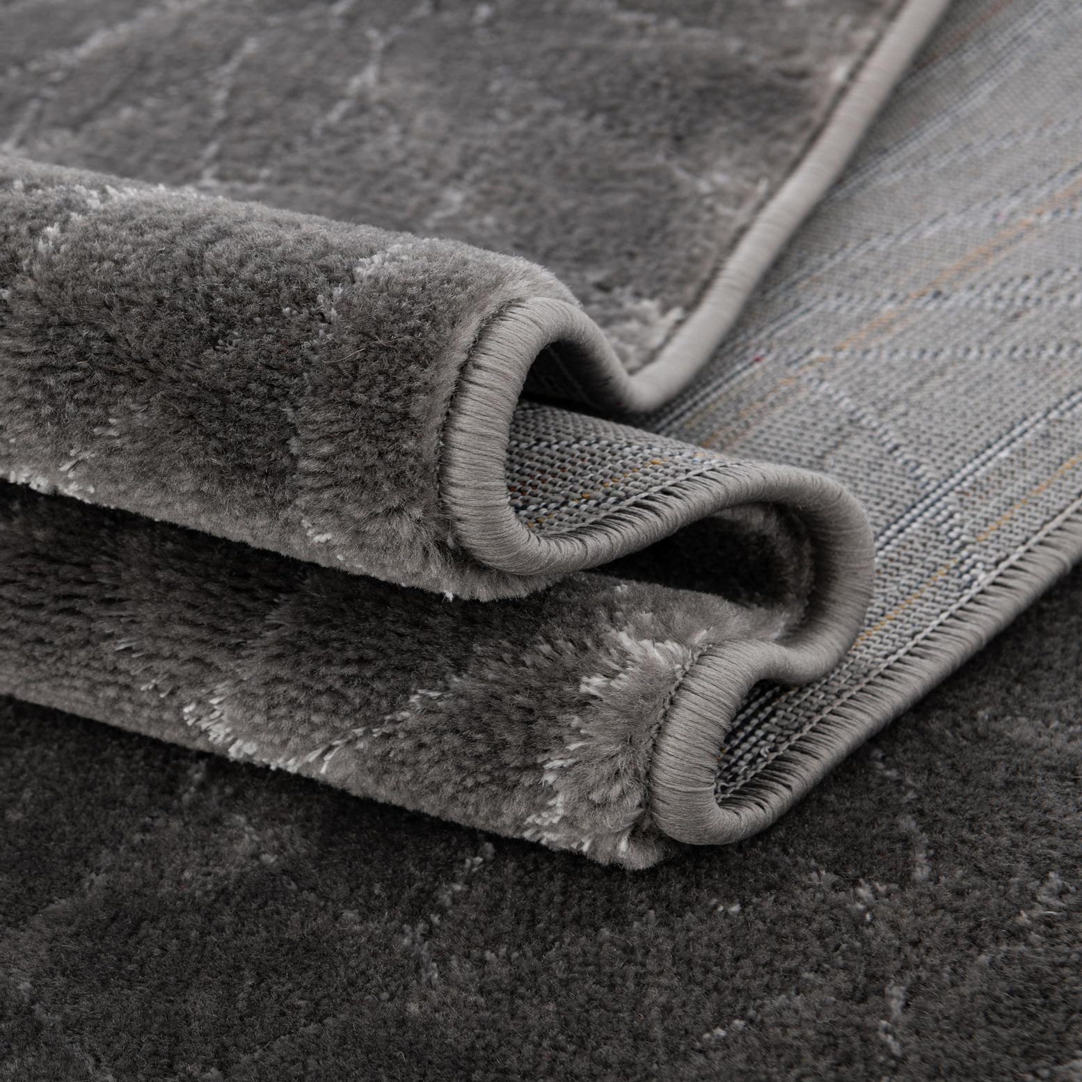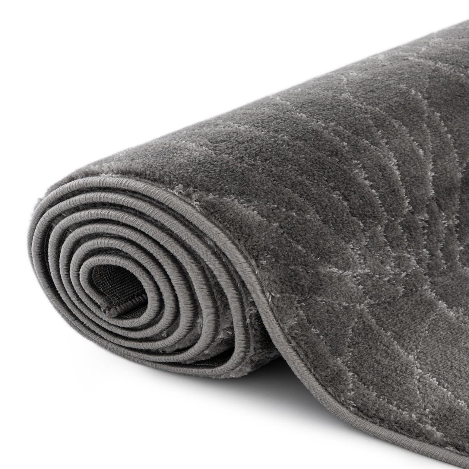 A refined trellis pattern of fan-like motifs spreads evenly across a Gray Silver field, the lighter latticework offering a gentle contrast that reads as sophisticated and restrained. The design has a modern-meets-transitional feel, with clean geometry softened by the organic, petal-shaped repeats. Run your hand across the surface and you'll notice a low-profile, slightly velvety pile that feels smooth underfoot and carries a subtle sheen from the fibers, giving the rug a polished look without drawing too much attention.