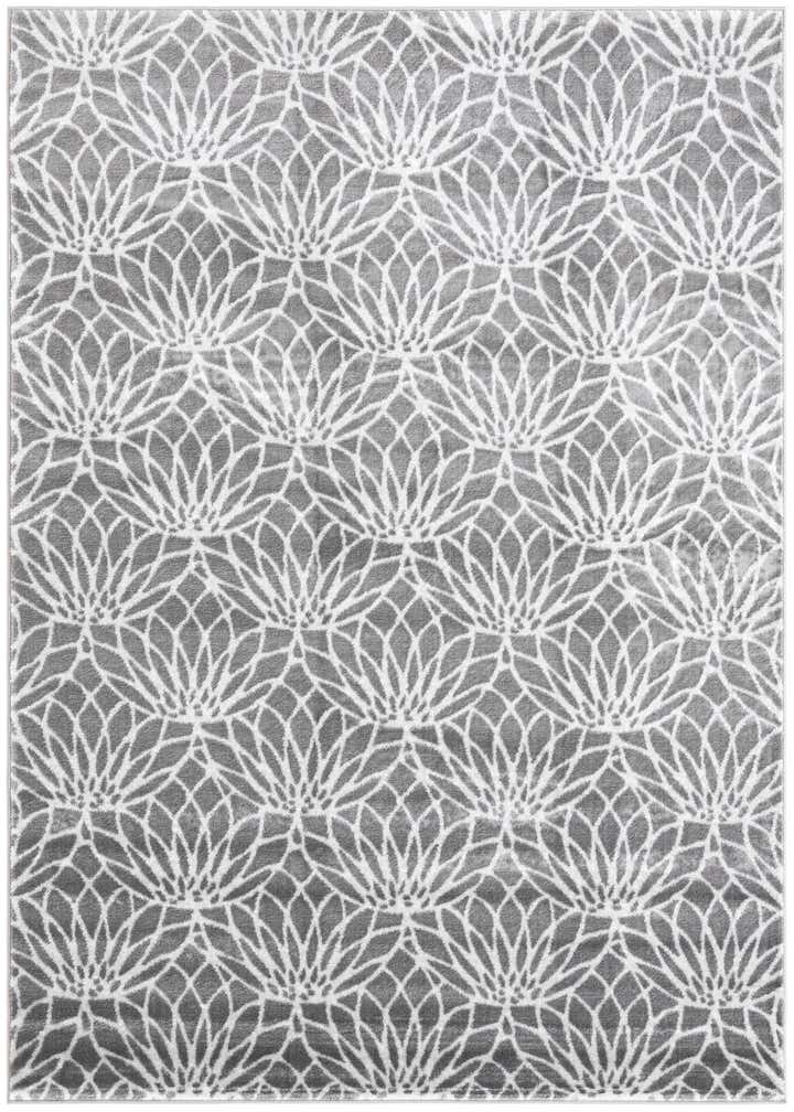 A refined trellis pattern of overlapping, fan-like petals creates a rhythmic, geometric field across a Gray Silver ground. The motif is rendered in a clean white that contrasts crisply with the cool metallic tone beneath, giving the design a modern, textile-driven look. Machine made of 70% polypropylene and 30% polyester, the rug has a short, dense pile that feels softly cushioned underfoot while the polyester fibers add a subtle, light-catching sheen to the surface.