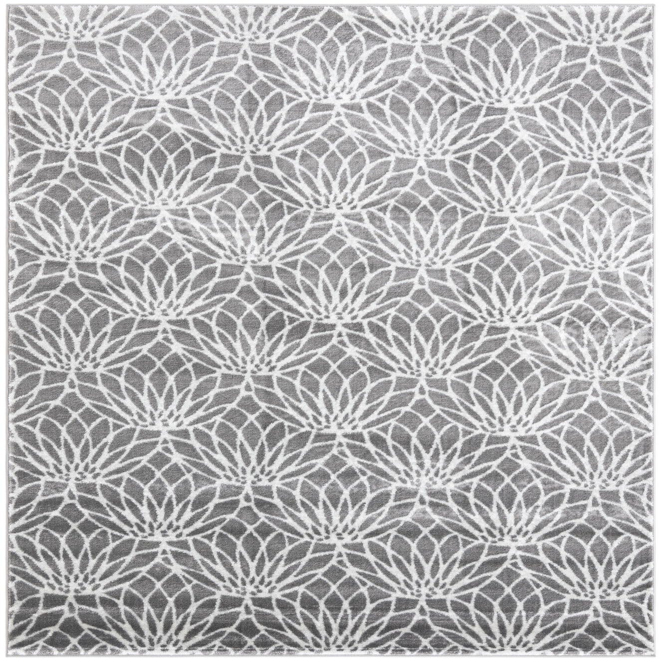 A 6x9 rectangular gray area rug with a repeating modern floral trellis pattern in white, perfect for a living room.