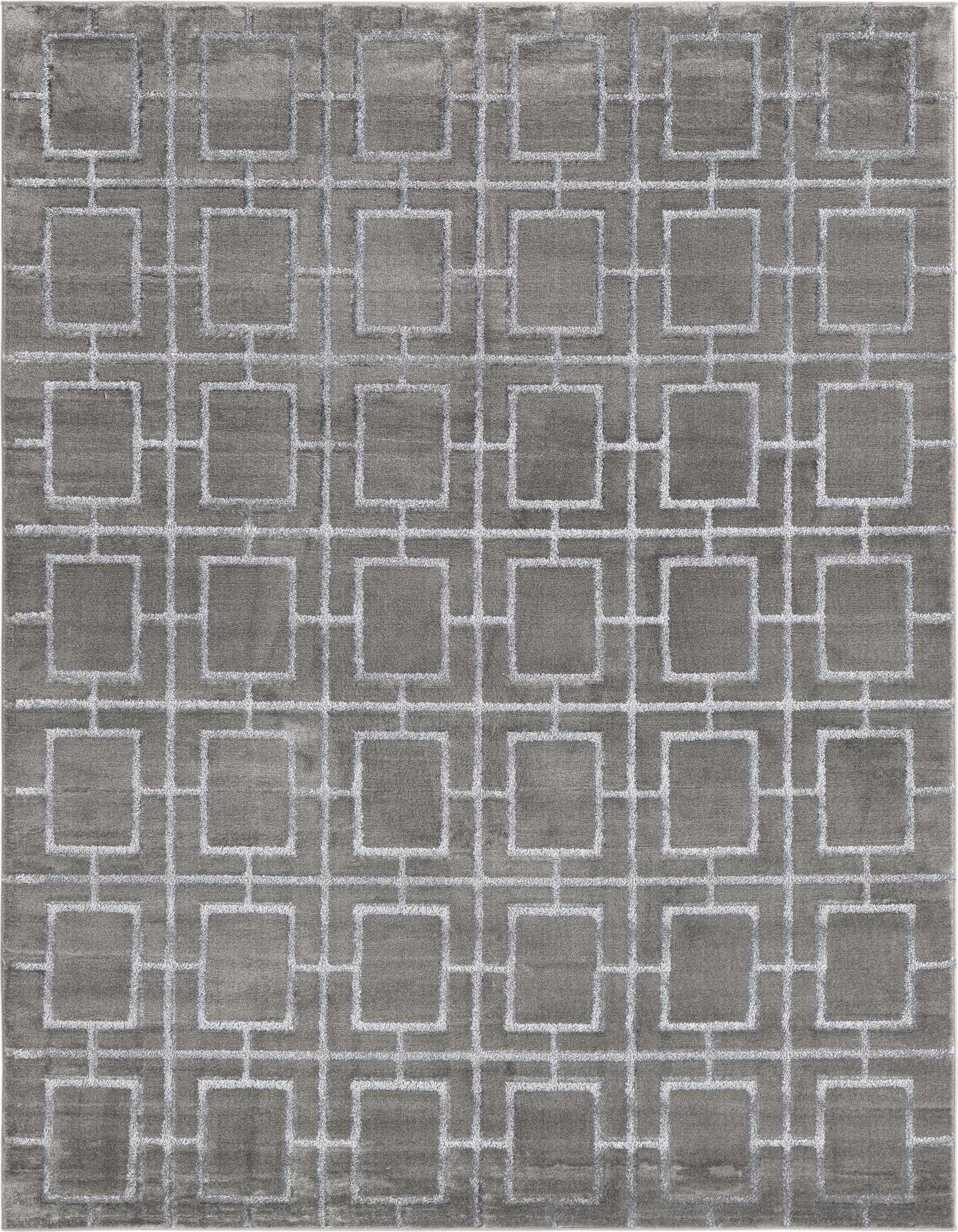 A 7x10 rectangular gray area rug with a modern Hollywood Glam trellis pattern in varying pile heights.