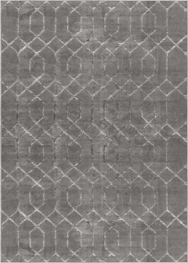 A tone-on-tone trellis pattern is cut into a Gray Silver field, creating a network of interlocking geometric motifs that catch the light with a subtle, satiny sheen. The raised pattern contrasts gently with a plush, velvety ground, giving the surface a low-relief texture you can feel underfoot. Machine-made from 70% polypropylene and 30% polyester, the construction delivers a smooth, consistent pile with a soft hand and refined sculpted finish.
