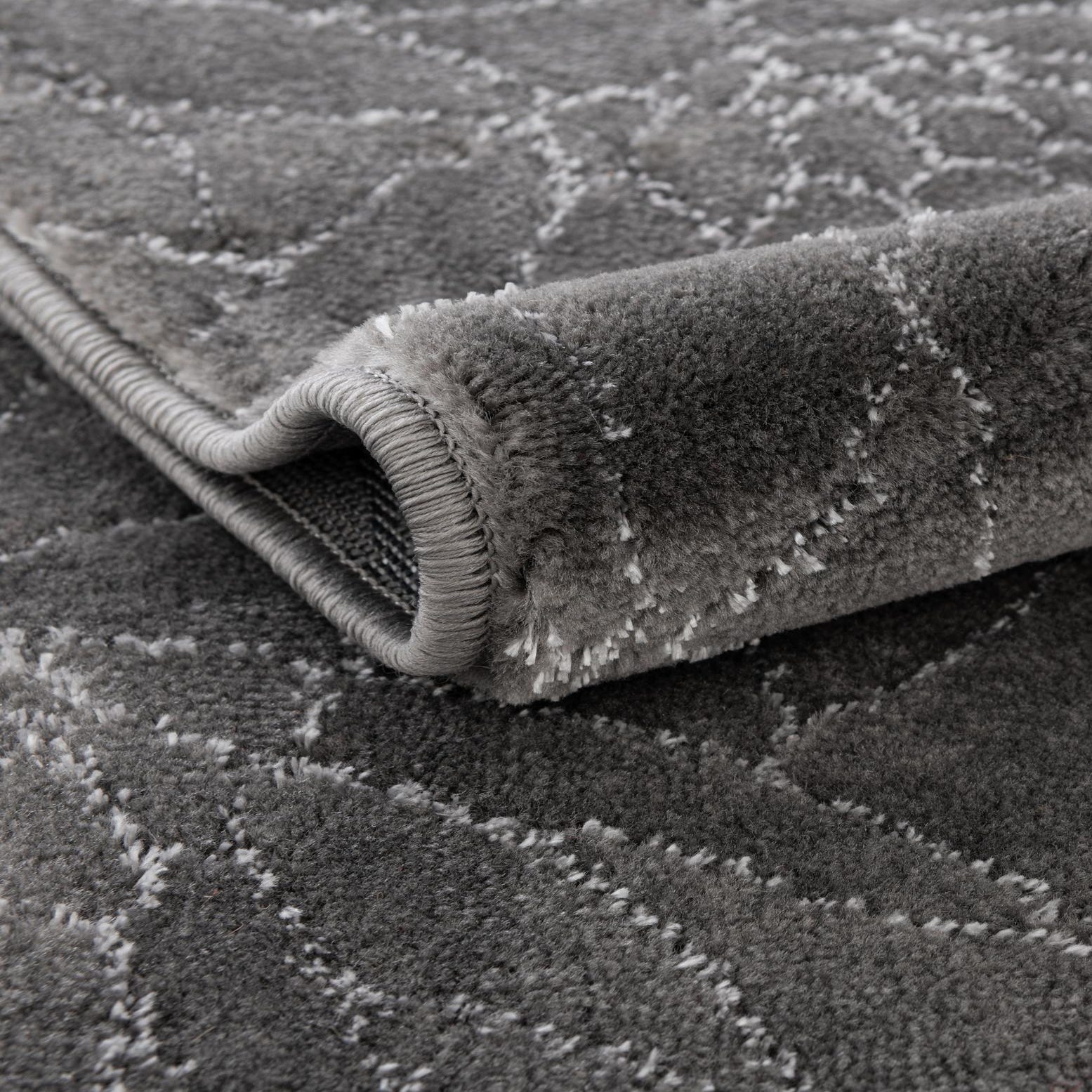 A repeating trellis of stylized floral motifs sits in silver over a gray-silver ground, creating a rhythmic, geometric floral pattern that reads both modern and refined. The machine-made construction (70% polypropylene, 30% polyester) delivers a low-profile pile with a soft hand and a slight sheen from the silver fibers, so the pattern has gentle dimensionality underfoot without heavy texture. The round silhouette and balanced repeat give the piece a composed, polished look.