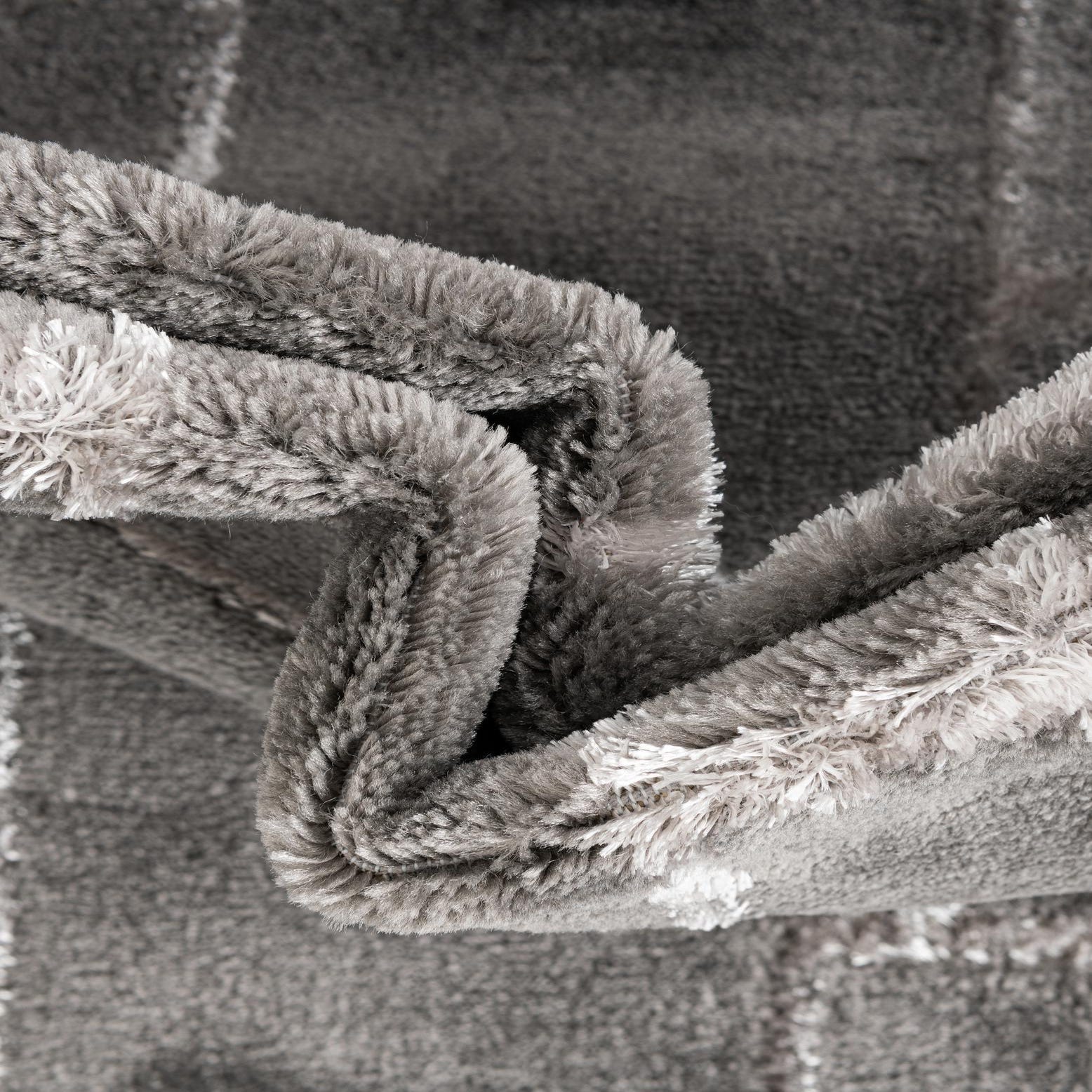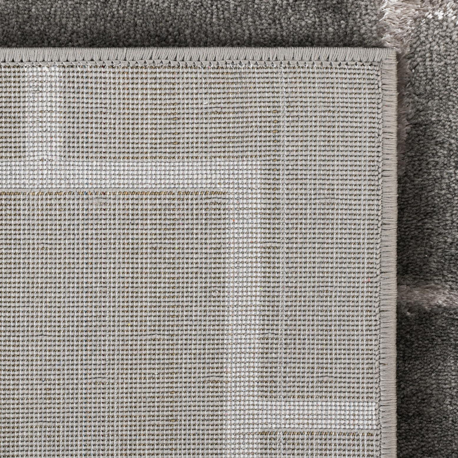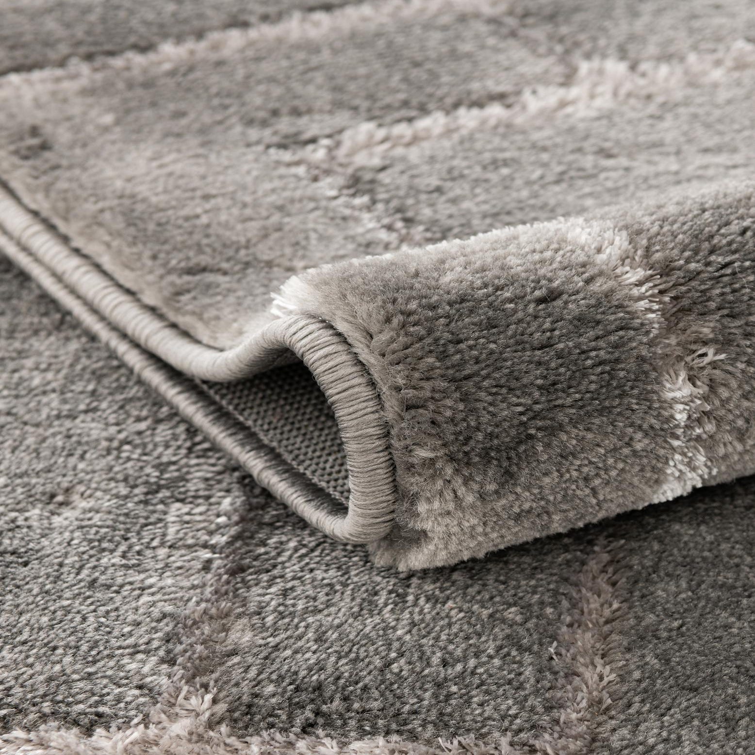 A modern trellis pattern in gray-silver tones brings clean geometry and quiet shine to the room. Rectangular linked motifs in a silver hue sit against a gray-silver ground, the contrast created by slightly raised lines that add a gentle dimensionality underfoot. Machine-made of 70% polypropylene and 30% polyester, the rug offers a soft, low-to-medium pile—polyester gives a subtle sheen while polypropylene provides resilient structure and easy movement of furniture across the surface.