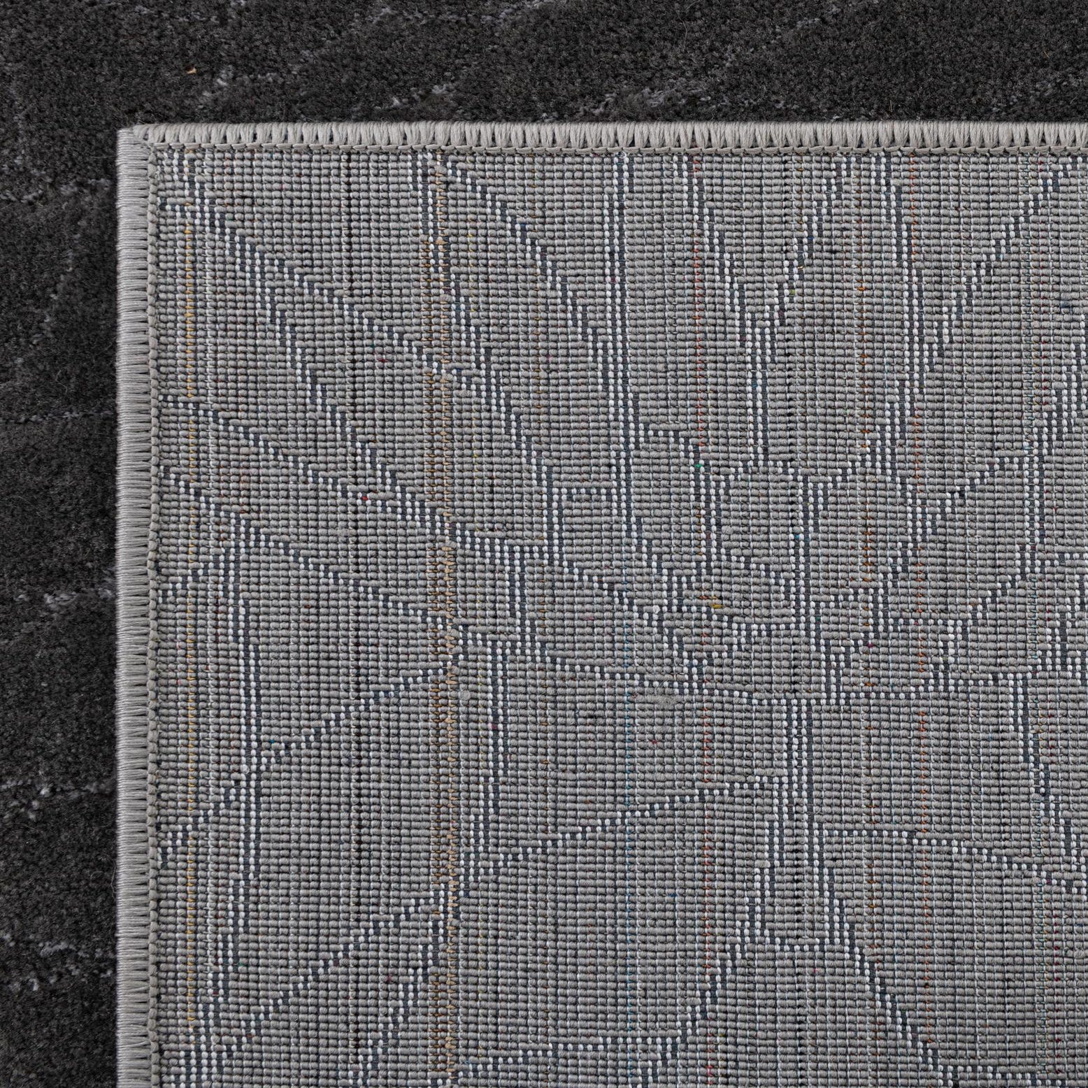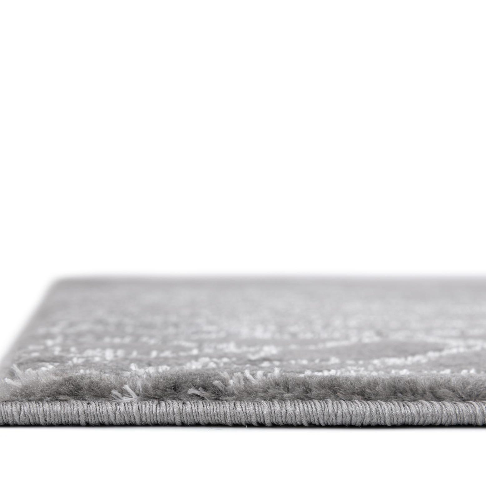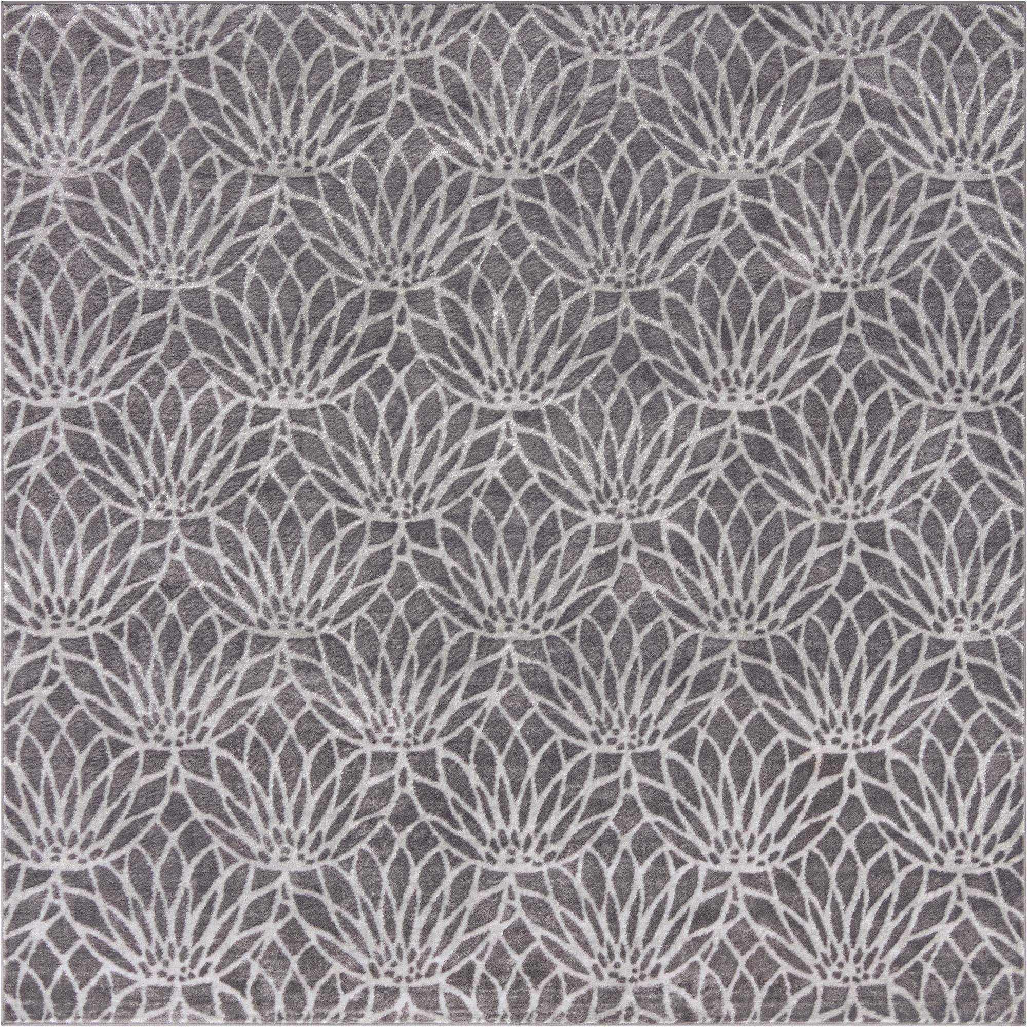 A square gray area rug with a repeating modern floral trellis pattern in silver-gray, featuring a textured pile.
