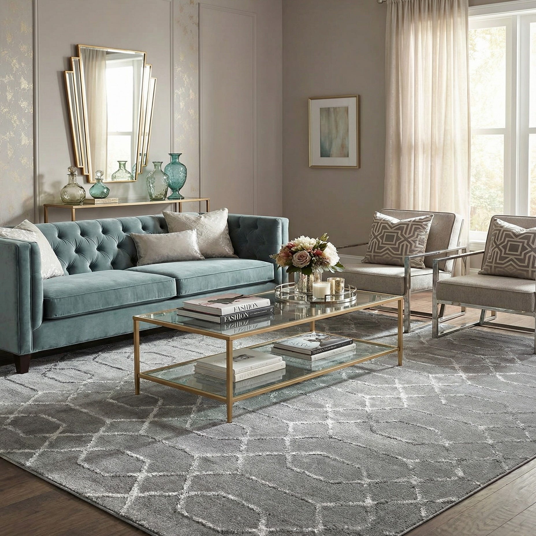 This neutral Silver palette works well in contemporary and transitional spaces — anchor a living room seating area, layer it beneath a glass dining table for a touch of shimmer, or place it in a bedroom to create a calm, polished foundation. Pair with chrome or mirrored accents for a glam vibe, with cool woods and soft linens for a modern serene look, or with warmer metallics and rich textiles to add contrast and warmth.