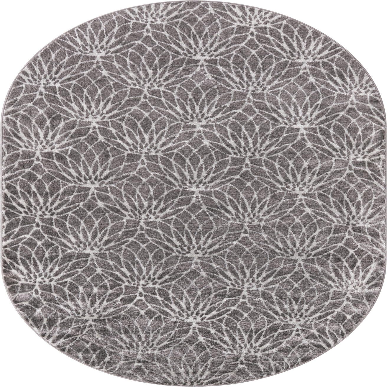 An oval gray and silver area rug featuring a modern floral trellis pattern, perfect for adding Hollywood glam to any indoor space.