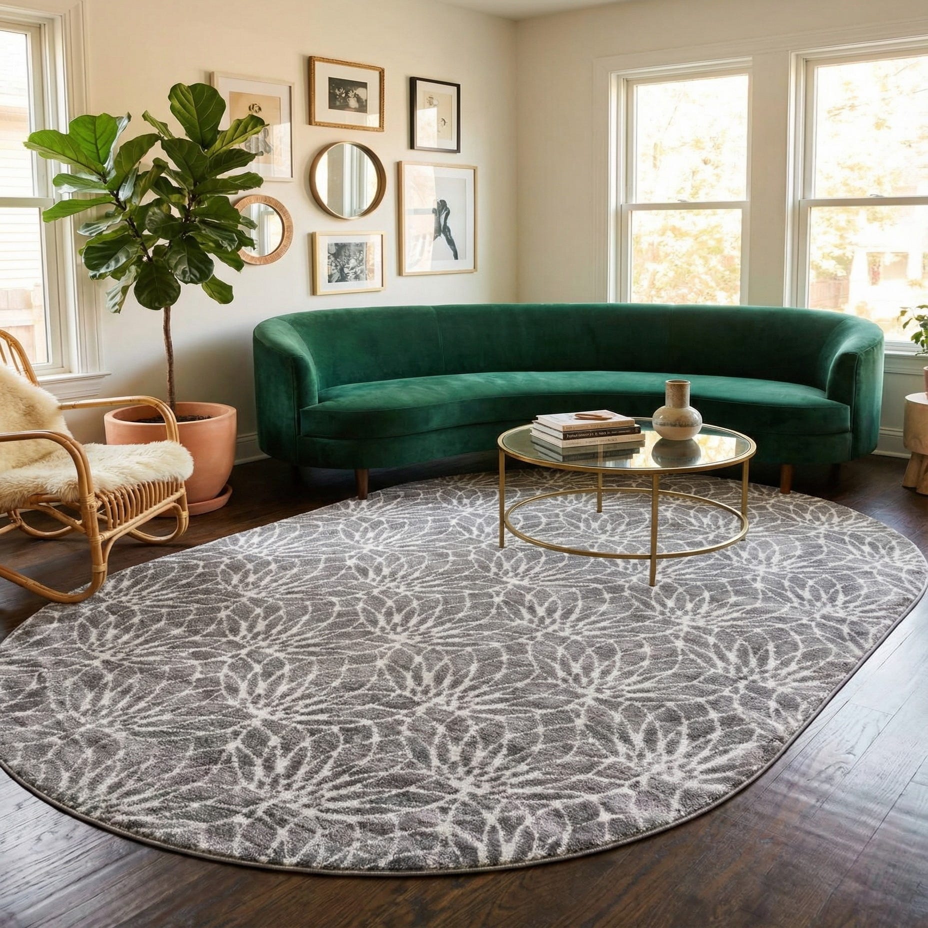 A rhythmic trellis of stylized floral bursts lays across a cool Gray Silver field, the repeating motif rendered in a soft ivory that creates a subtle two-tone effect. The oval silhouette and evenly spaced pattern produce a gentle, flowing look that brings movement without overwhelming a room. The design blends geometric order with a floral touch, giving it a contemporary yet approachable character.