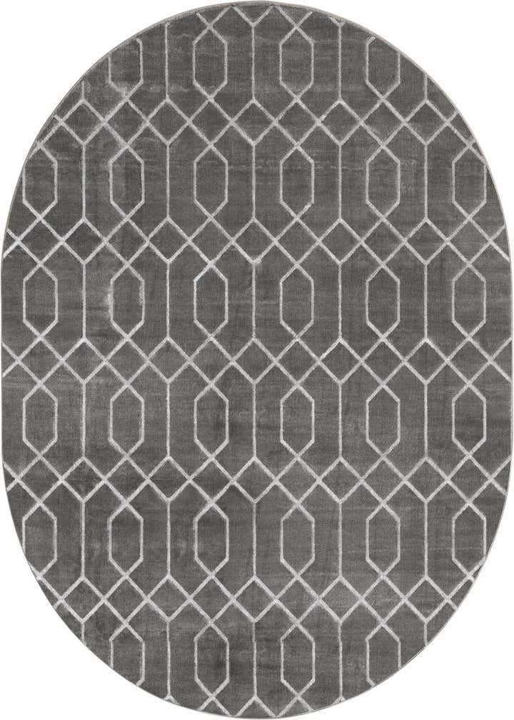 An oval gray rug with a repeating modern trellis pattern in lighter gray, showcasing a textured pile.