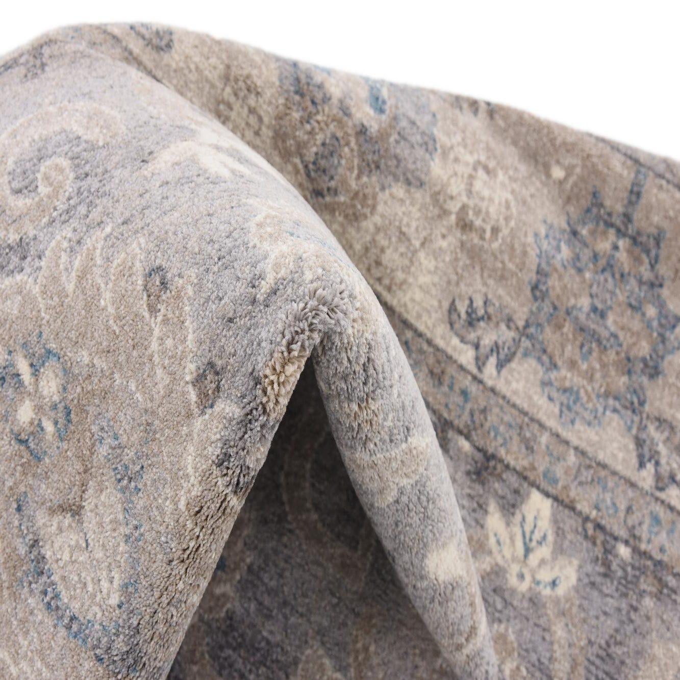Primary color is Gray. Colors in this rug include: Gray, Light Blue, Ivory.