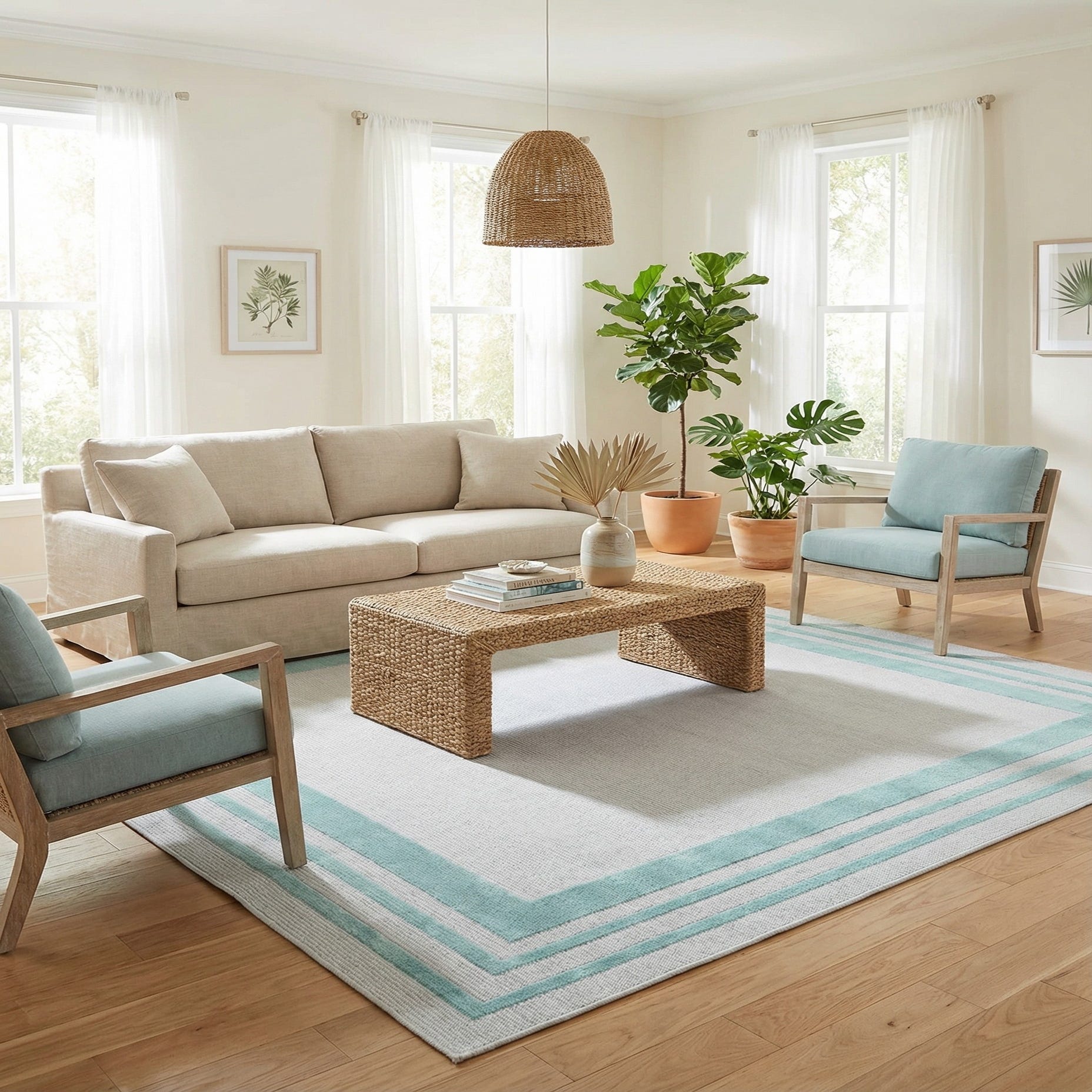 This piece works well on covered patios and sunrooms as well as in living or dining areas where a fresh, modern touch is wanted. Pair it with natural wicker or teak furnishings and linen upholstery for a relaxed coastal vibe, place it beneath a dining set with white or sand-toned chairs for crisp contrast, or use it to ground a minimalist seating arrangement with clean-lined sofas and metal accents.