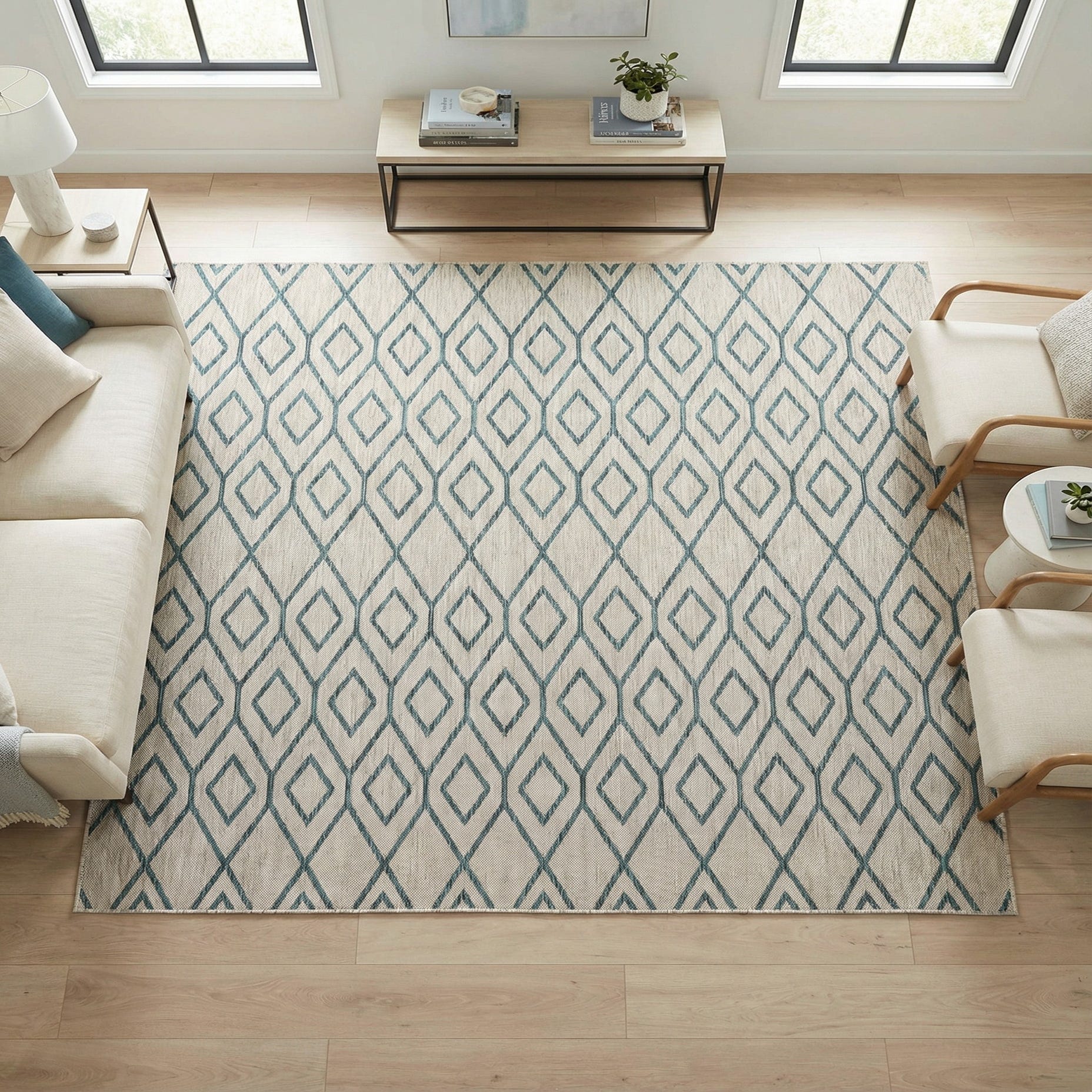 As a stain-resistant and pet-friendly option, this rug is well-suited for high-traffic areas, both indoors and outdoors. Its contemporary pattern harmonizes with a variety of decor styles, from modern urban balconies to casual coastal patios or transitional living spaces that bridge the indoors with the outdoors. Its clean lines and crisp color palette can also enhance minimalist and Scandinavian-inspired interiors, offering a fresh and inviting ground for conversation areas or dining sets.