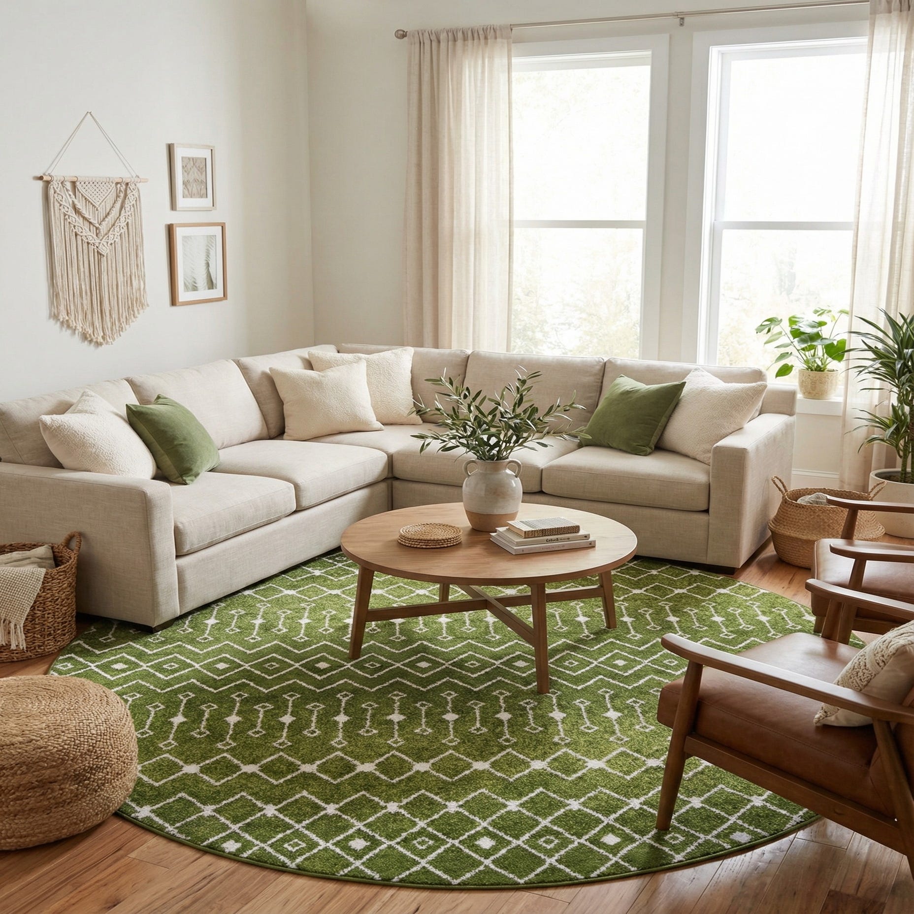 A 10-foot round green rug with a white Moroccan trellis pattern, featuring diamonds and tribal motifs.