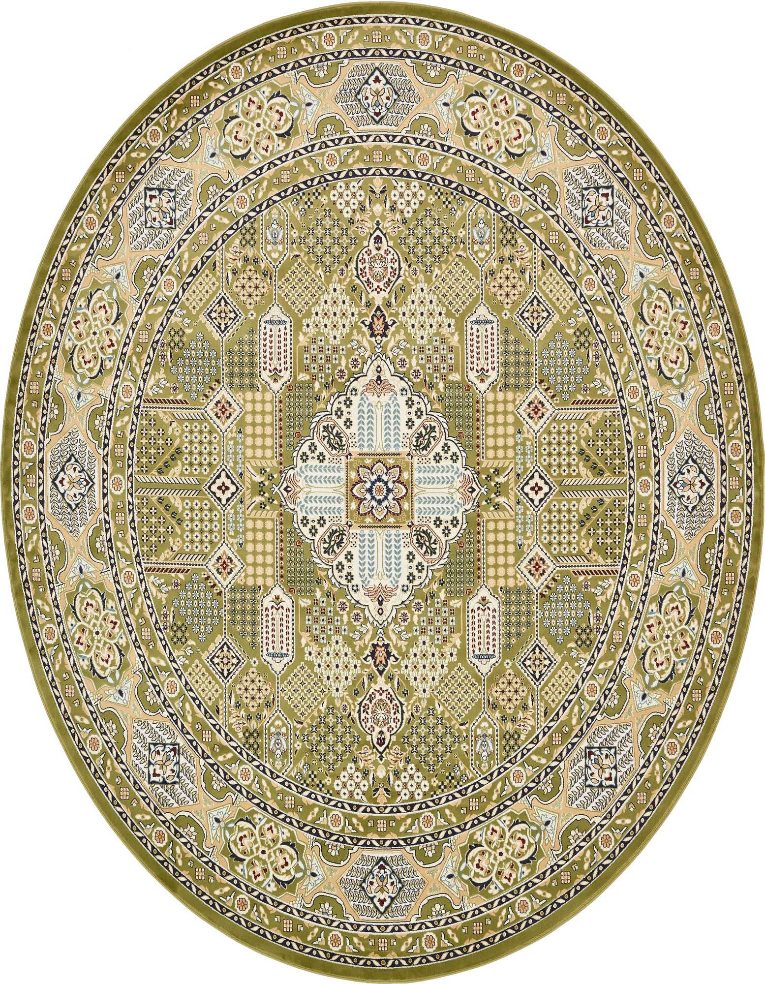 Primary color is Green. Colors in this rug include: Green, Blue, Burgundy, Cream, Ivory, Navy Blue, Puce.