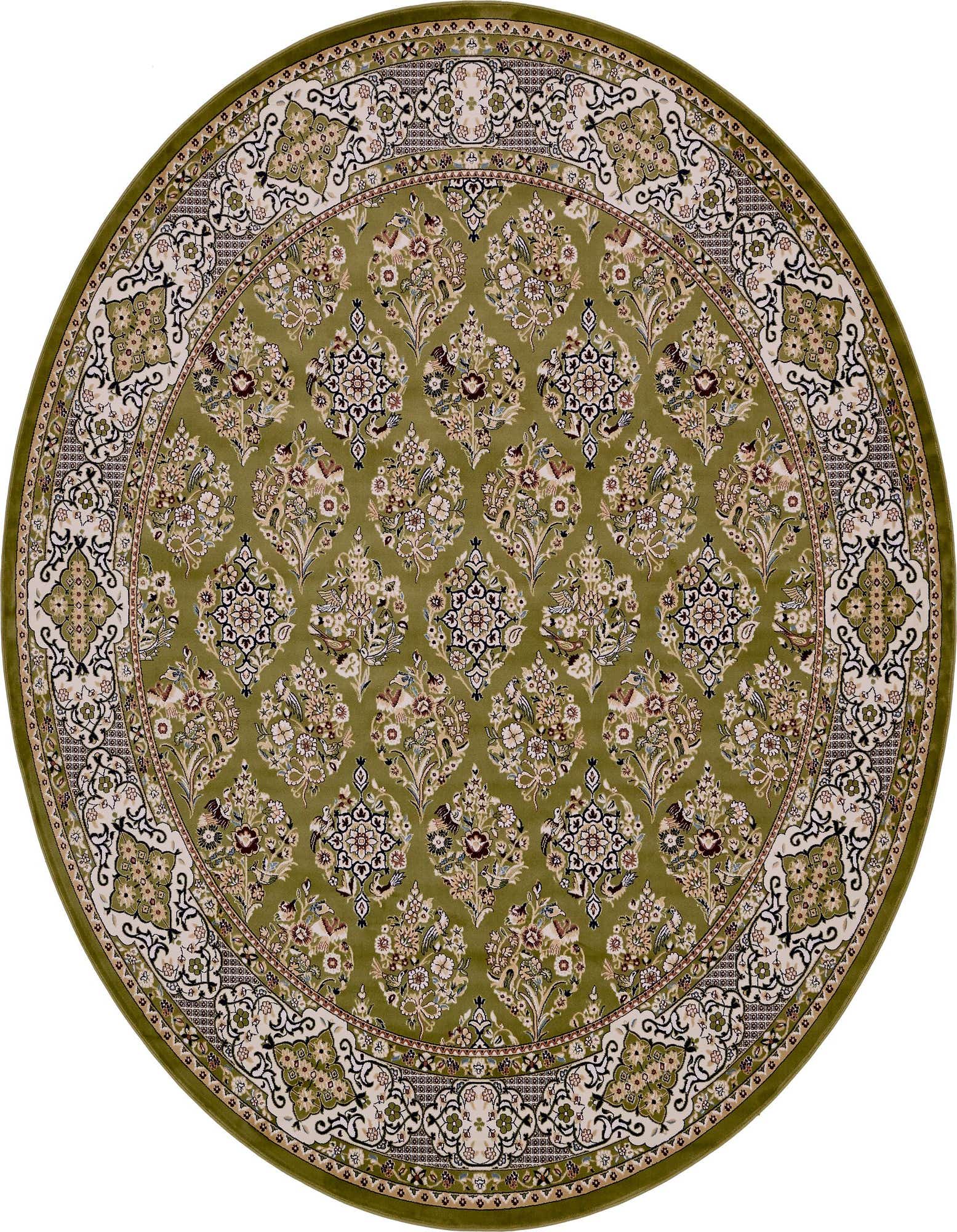 Primary color is Green. Colors in this rug include: Green, Beige, Blue, Burgundy, Cream, Ivory, Navy Blue, Puce.