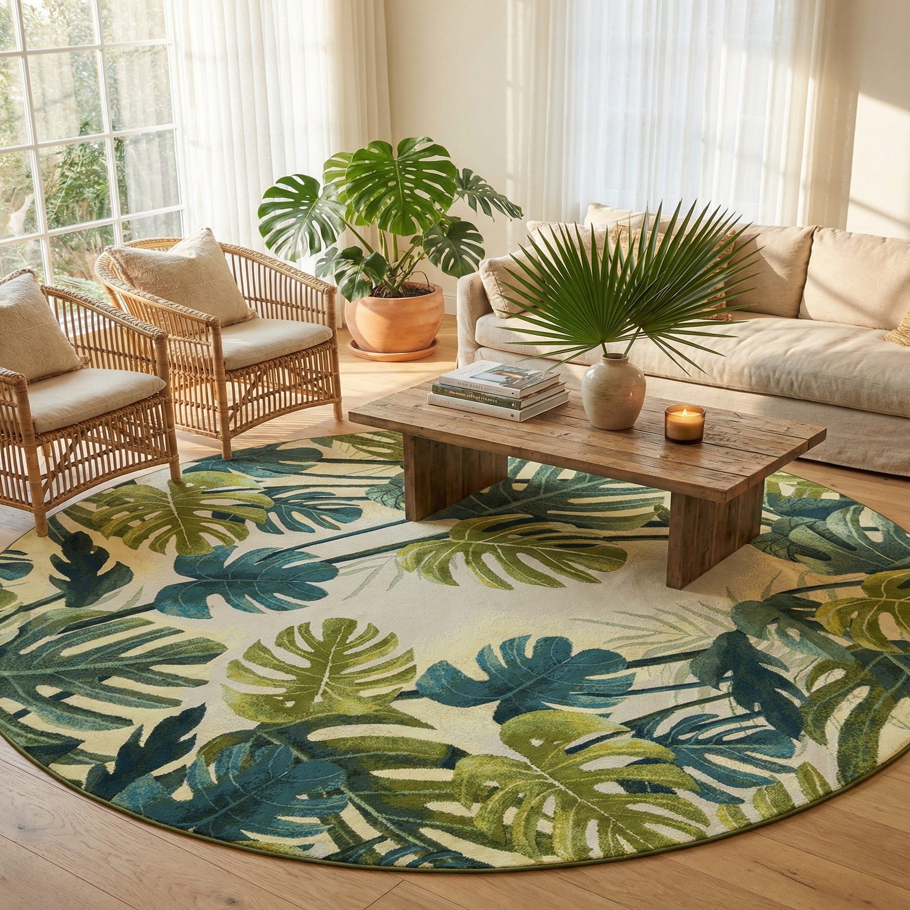 A 10' round green botanical rug featuring large monstera leaves in various shades of green on a light background, suitable for a patio.