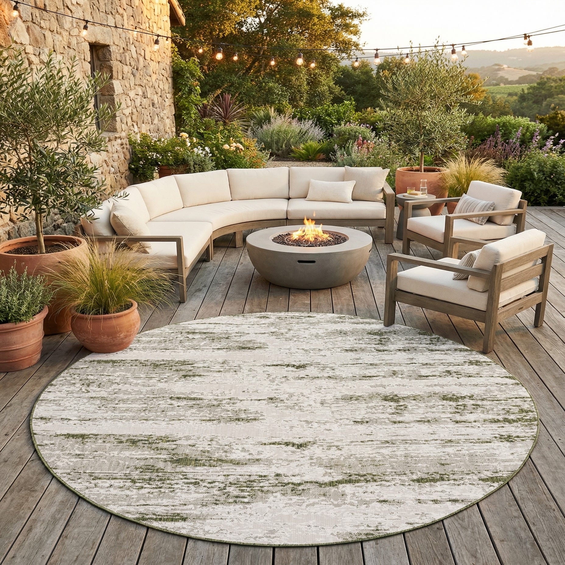 From the Outdoor Modern collection, this 10 Ft Round rug offers a fresh, contemporary look with its unique pattern and color scheme. Crafted with a machine-woven technique from 100% polypropylene, the rug showcases a blend of green and ivory tones set in an abstract design that provides visual interest without overwhelming a space. The green background gives it an organic feel ideal for complementing a variety of outdoor settings.