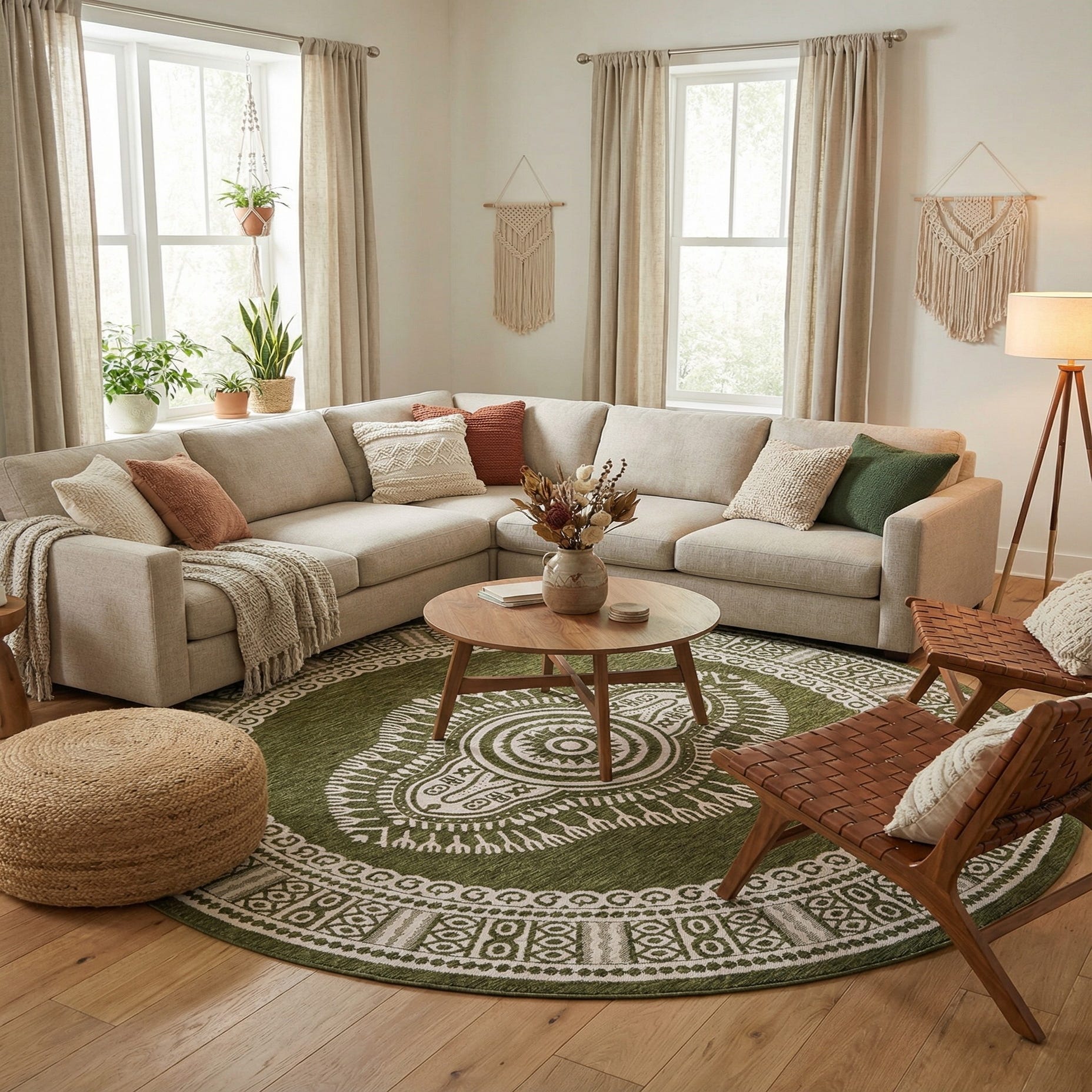 A round rug grounded by a leafy green field, this piece centers on a layered medallion rendered in crisp ivory. The design blends classical motifs with tribal-inspired accents: a sunburst-style center, surrounded by fringe-like radial elements and a series of geometric bands that form a structured, ornamental border. The contrast between the green background and the light pattern gives the motifs clear definition while maintaining an overall relaxed, vintage feel.