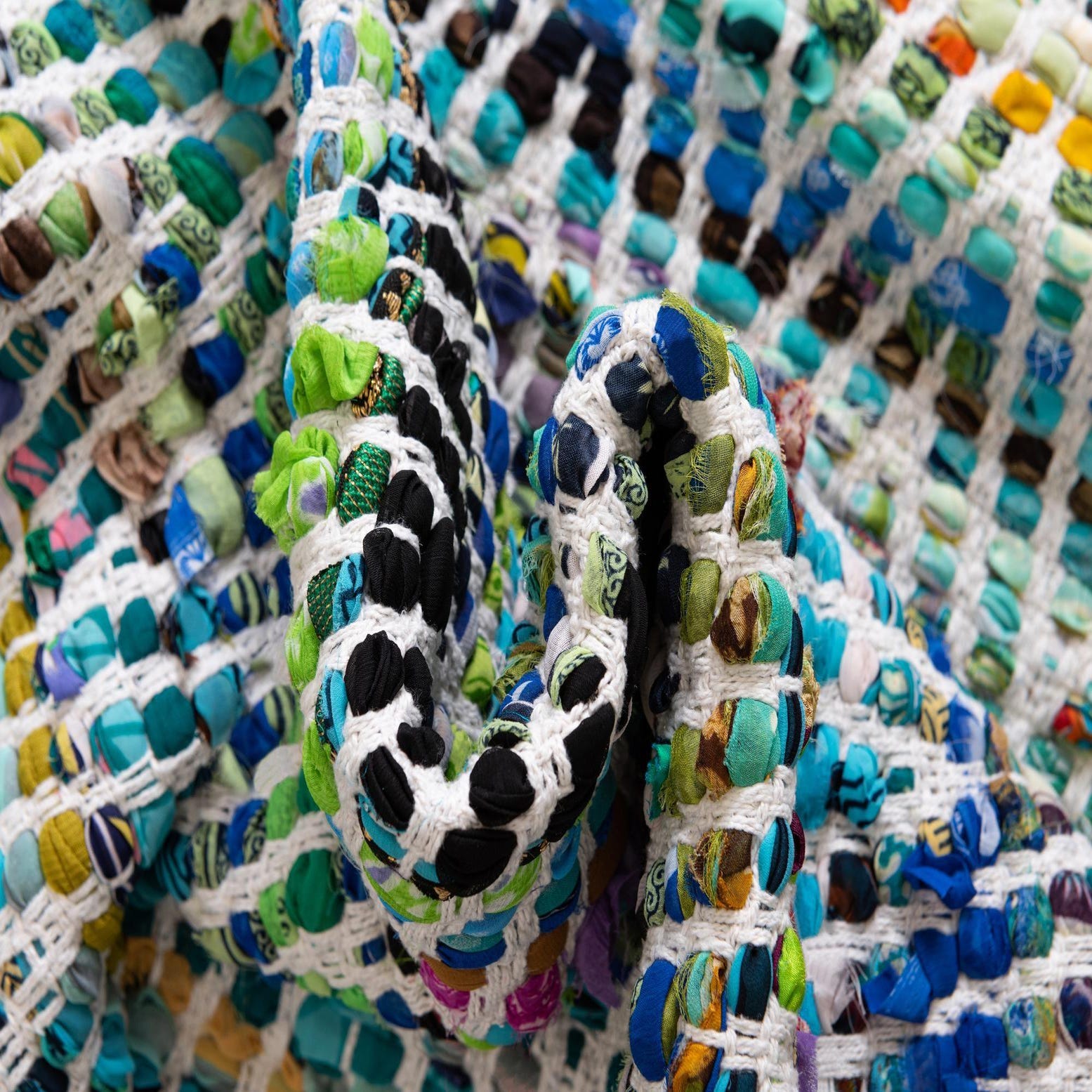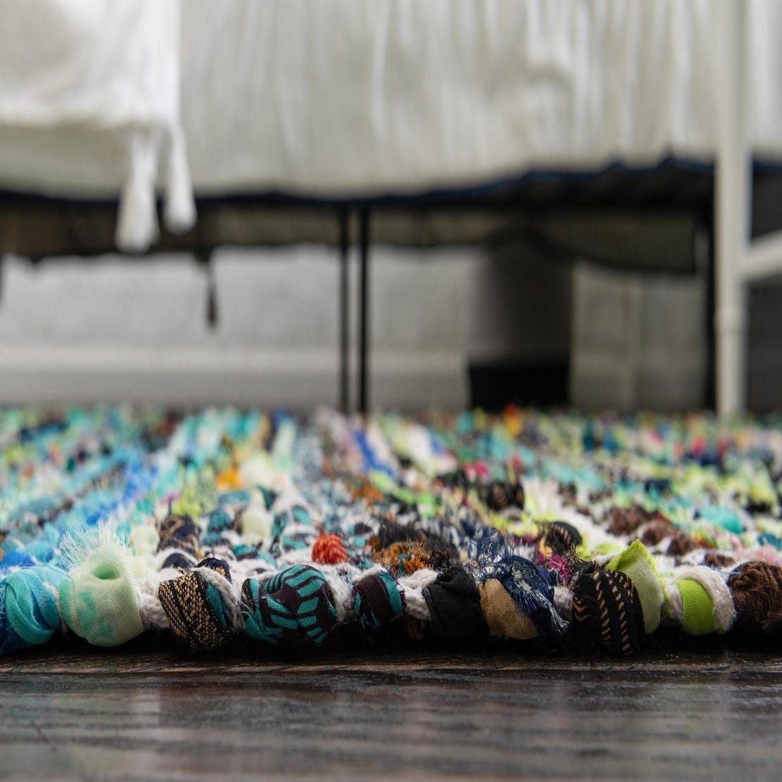 A hand-woven 100% cotton runner with a bold chevron weave, this piece rests on a green ground threaded with rows of multicolored cotton strips. Ivory and gray zigzag lines form the chevron motif while bands of navy, teal, turquoise, olive, blue, black, yellow and gold punctuate the design, creating a striped, time-worn look. The flat-woven construction produces a low-profile surface with a slightly nubby, tactile feel—you can feel the individual cotton strips under your feet and see the subtle texture where colors overlap.