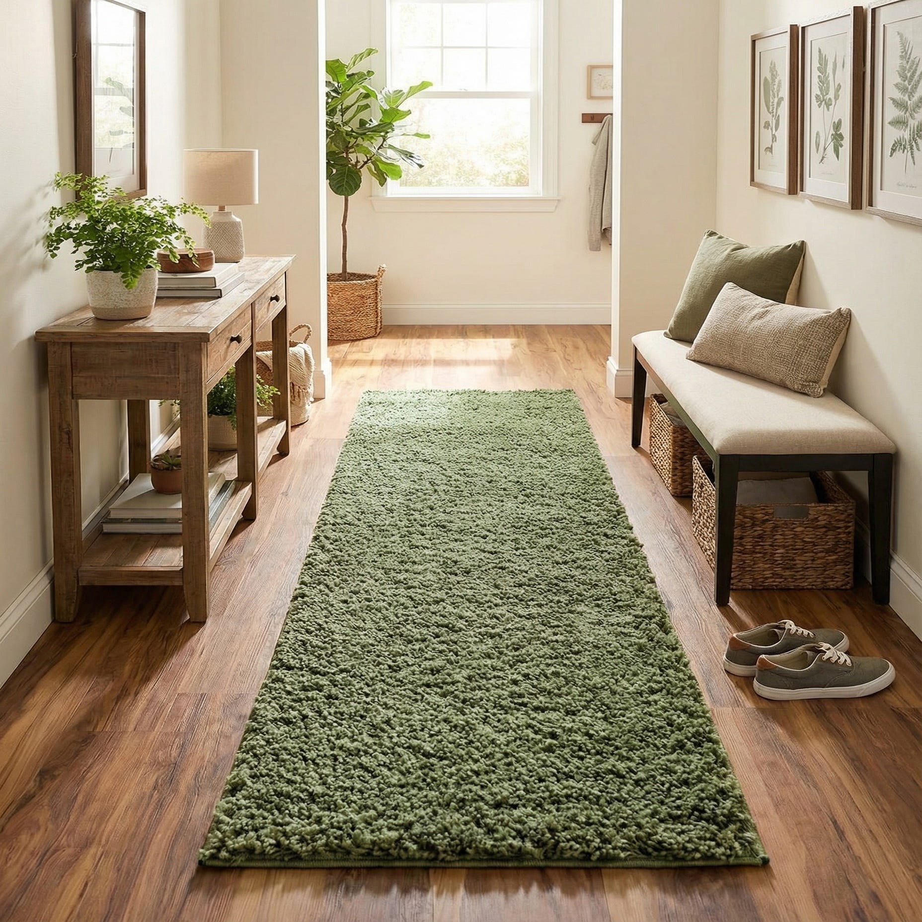 A soft, plush 10 Ft runner rug in a solid sage green color, perfect for a hallway.