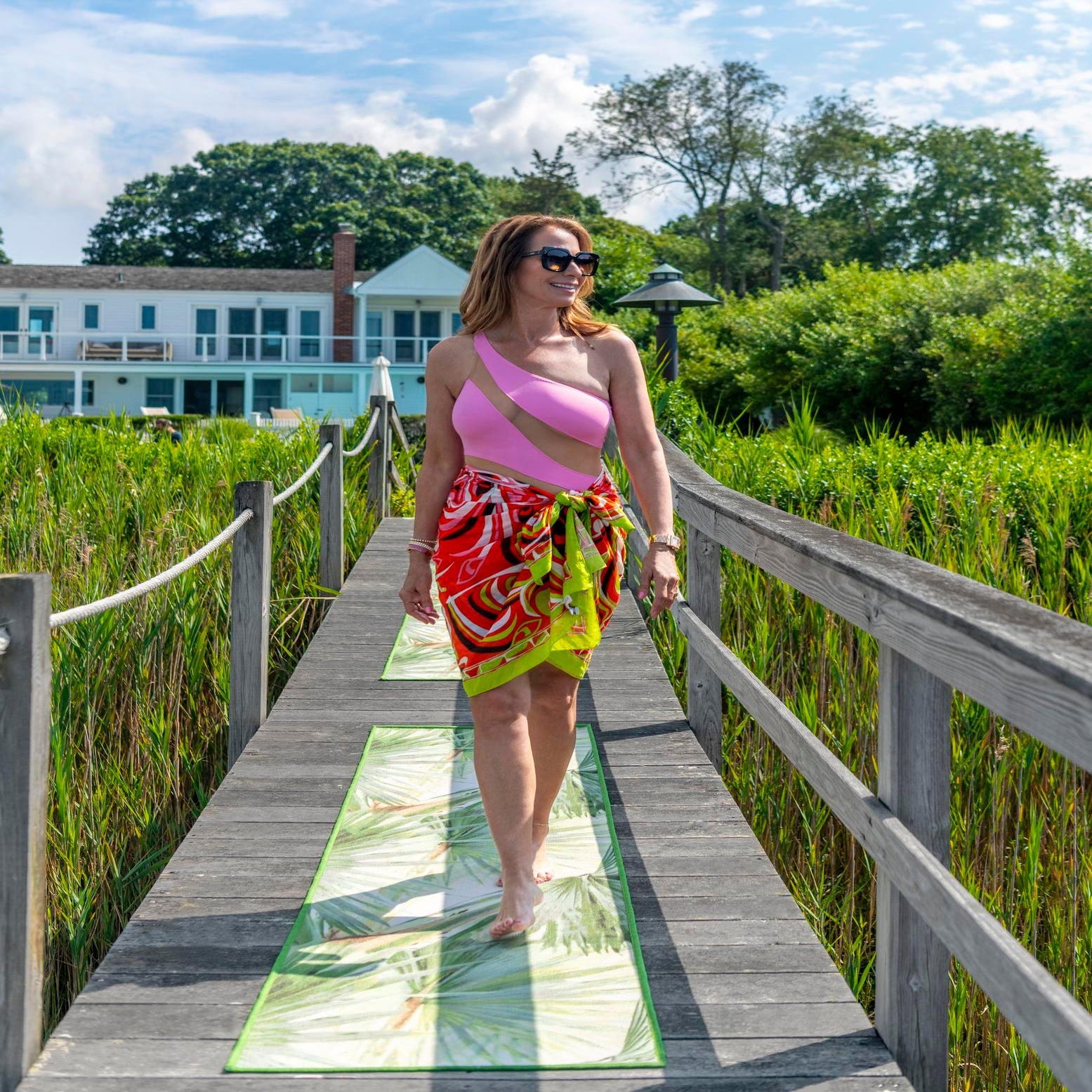 A 10 ft runner rug featuring a vibrant green tropical palm leaf pattern with a bright green border, suitable for indoor or outdoor use.