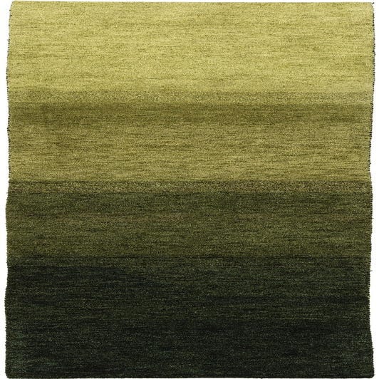 A 10 ft Kashkuli Gabbeh runner rug featuring a modern abstract design with a gradient of greens, from light lime to deep forest green.