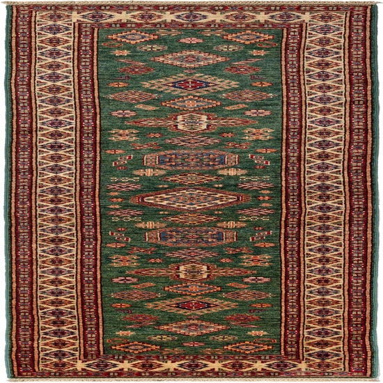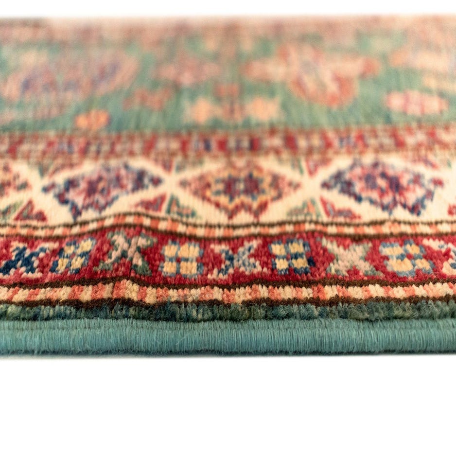 Primary color is green. Colors in this rug include: green, Brown, Beige.
