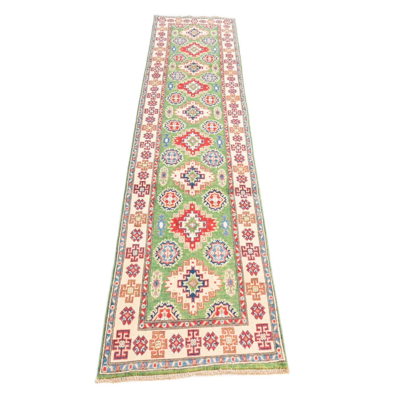 A 10 Ft runner rug featuring a vibrant green field with a traditional Southwestern pattern in red, blue, and cream.