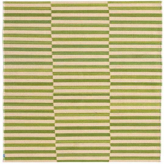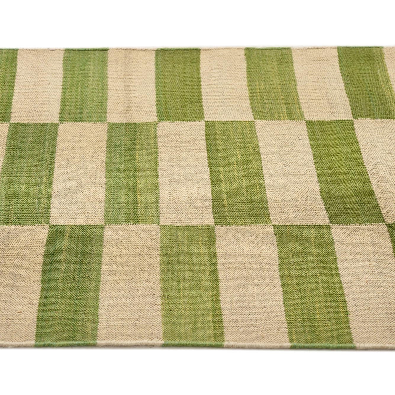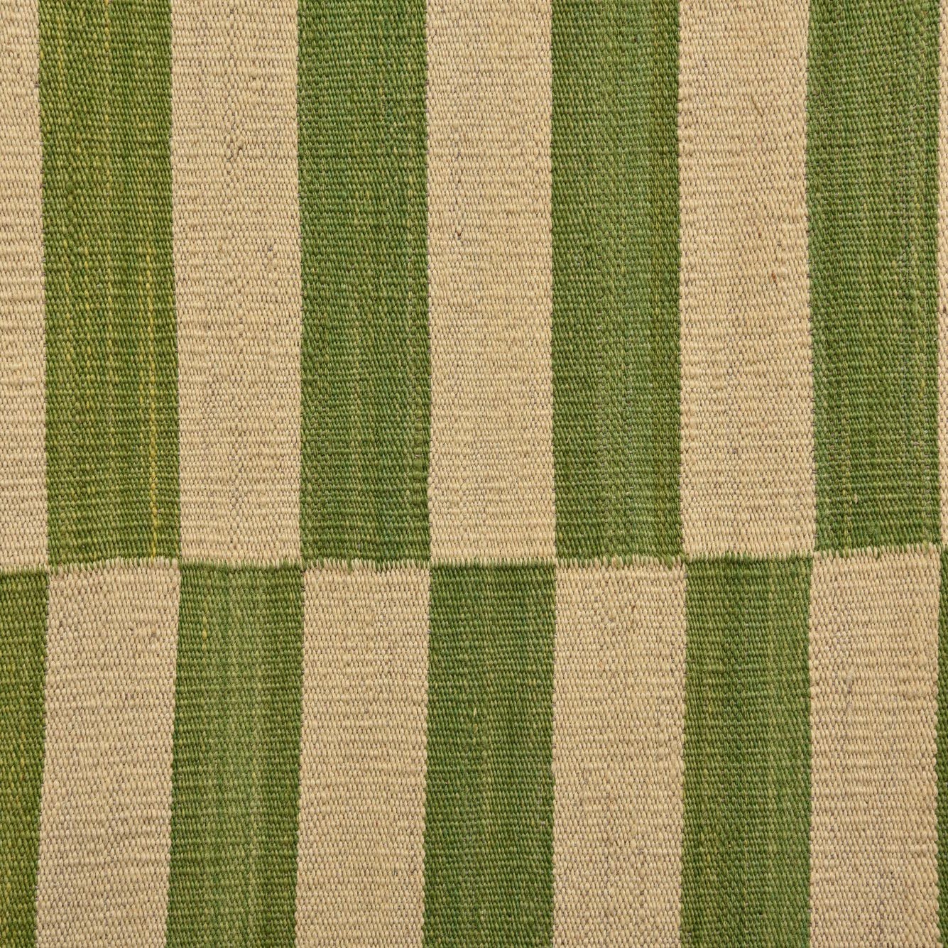 The green background of the rug paired with the neutral ivory stripes makes it an ideal choice for those seeking to introduce a natural element into their space without overwhelming it. Its clear, clean lines and the durability of the wool make this runner a functional choice for high-traffic areas such as hallways or narrow living spaces.