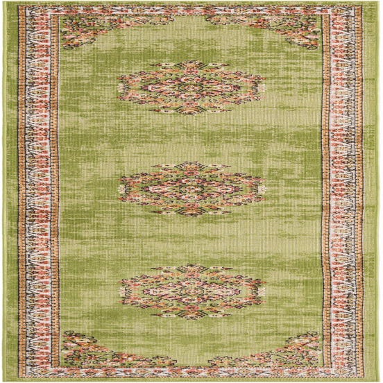 Machine-made from 100% polypropylene, the rug has a low, dense pile that lies flat and feels smooth underfoot. Its construction makes it well suited to narrow traffic areas such as hallways, entryways or alongside kitchen islands. Pair it with light wood floors and neutral upholstery for a fresh, cottage or farmhouse aesthetic, or layer it into an eclectic or transitional scheme where the green field and warm accents can tie together mixed patterns and finishes.