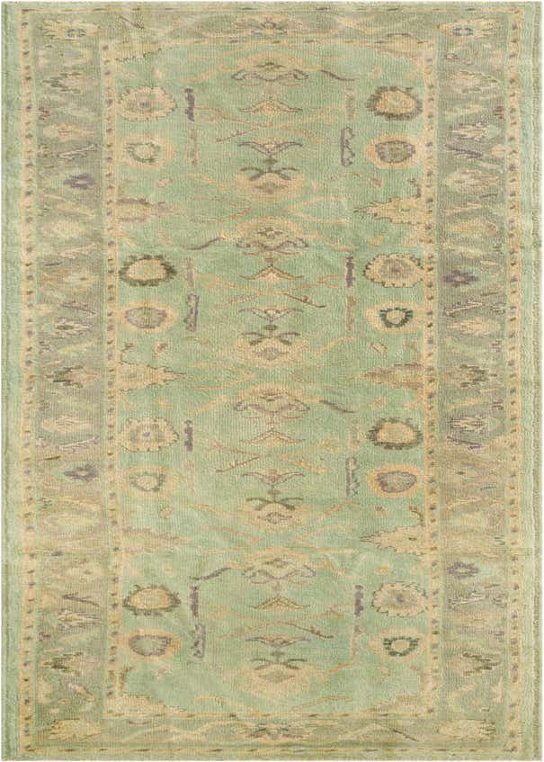 Primary color is Green. Colors in this rug include: Green, Gray, Ivory, Violet.