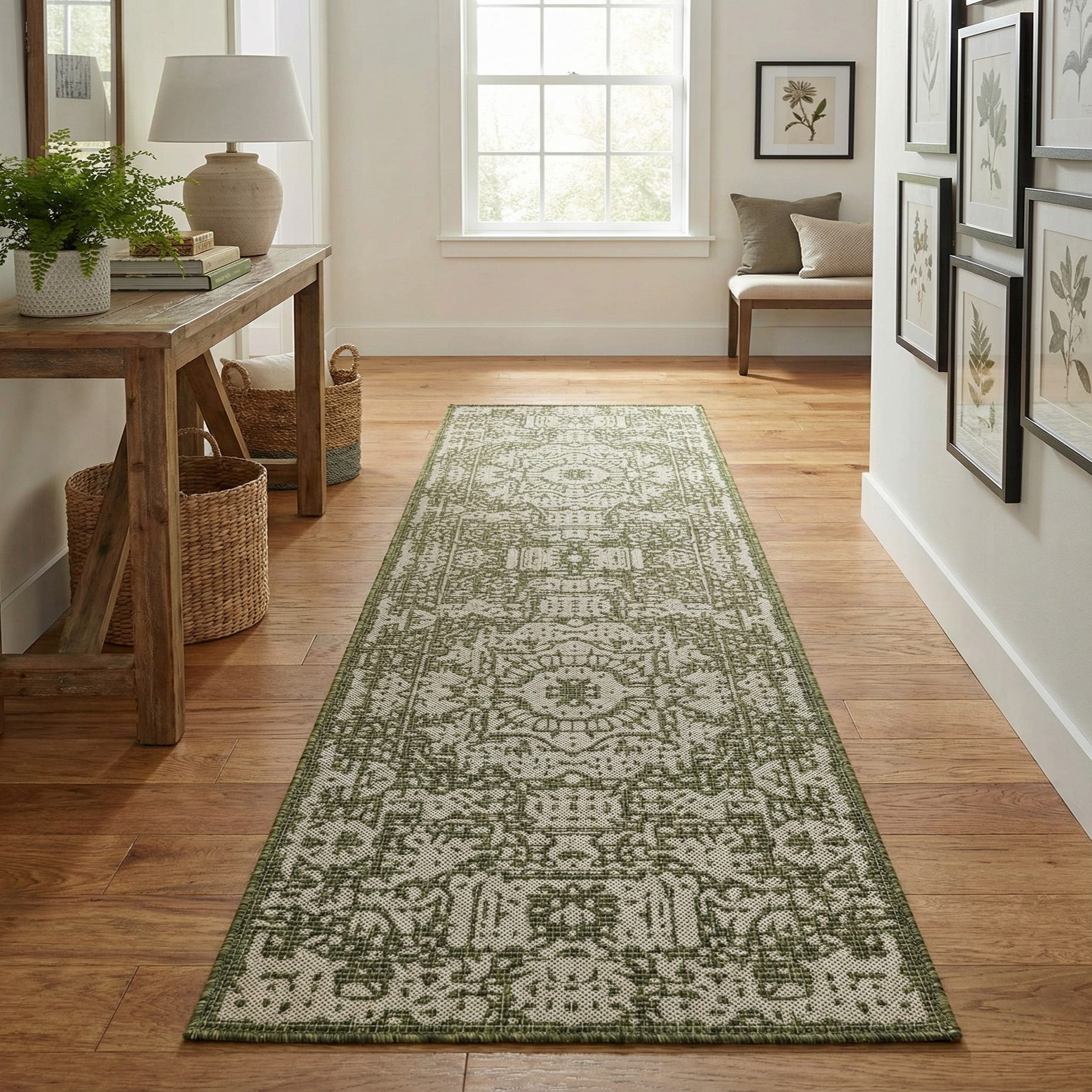 A 10 ft runner rug from Rugs.com's Outdoor Traditional collection, featuring a green and light grey Southwestern and traditional pattern.