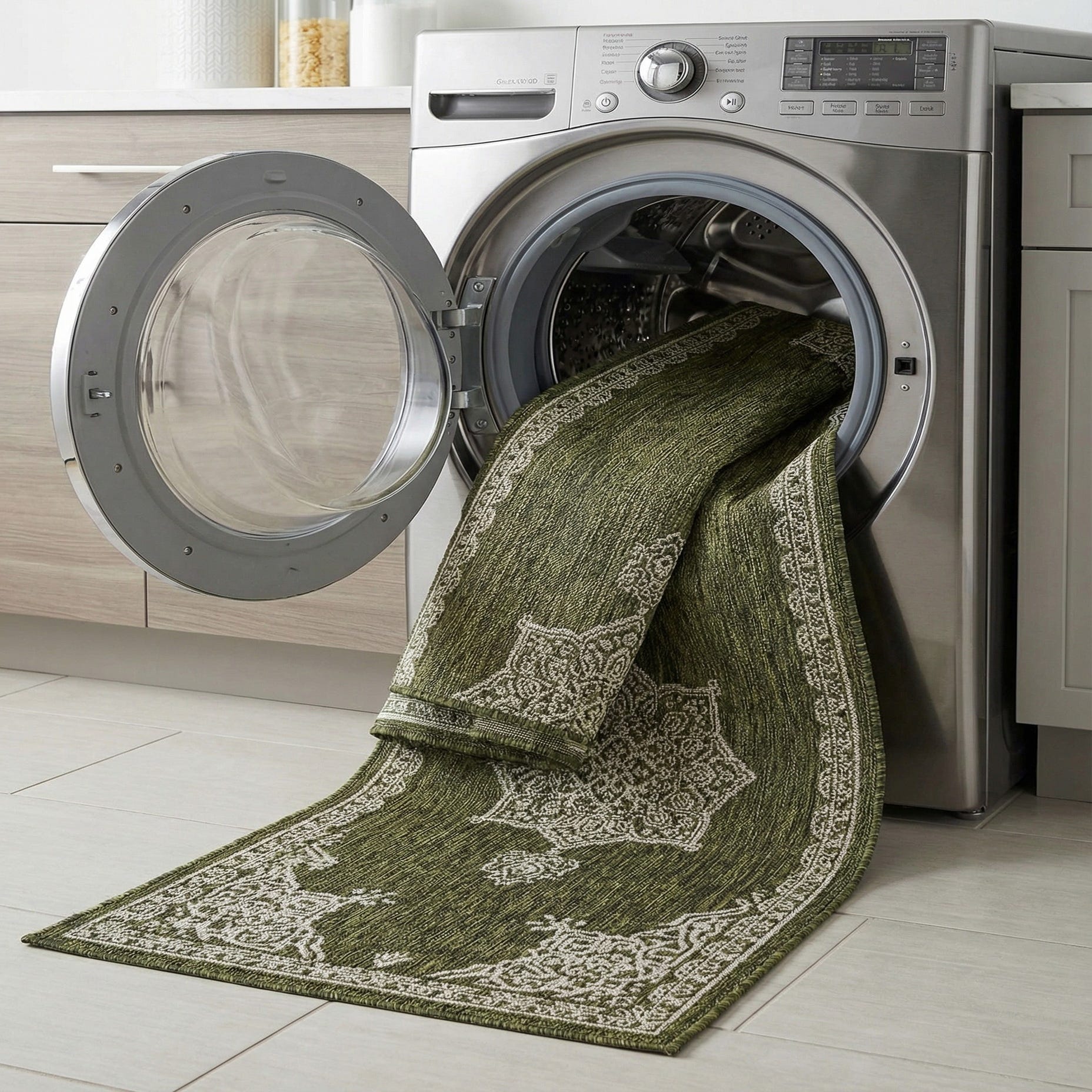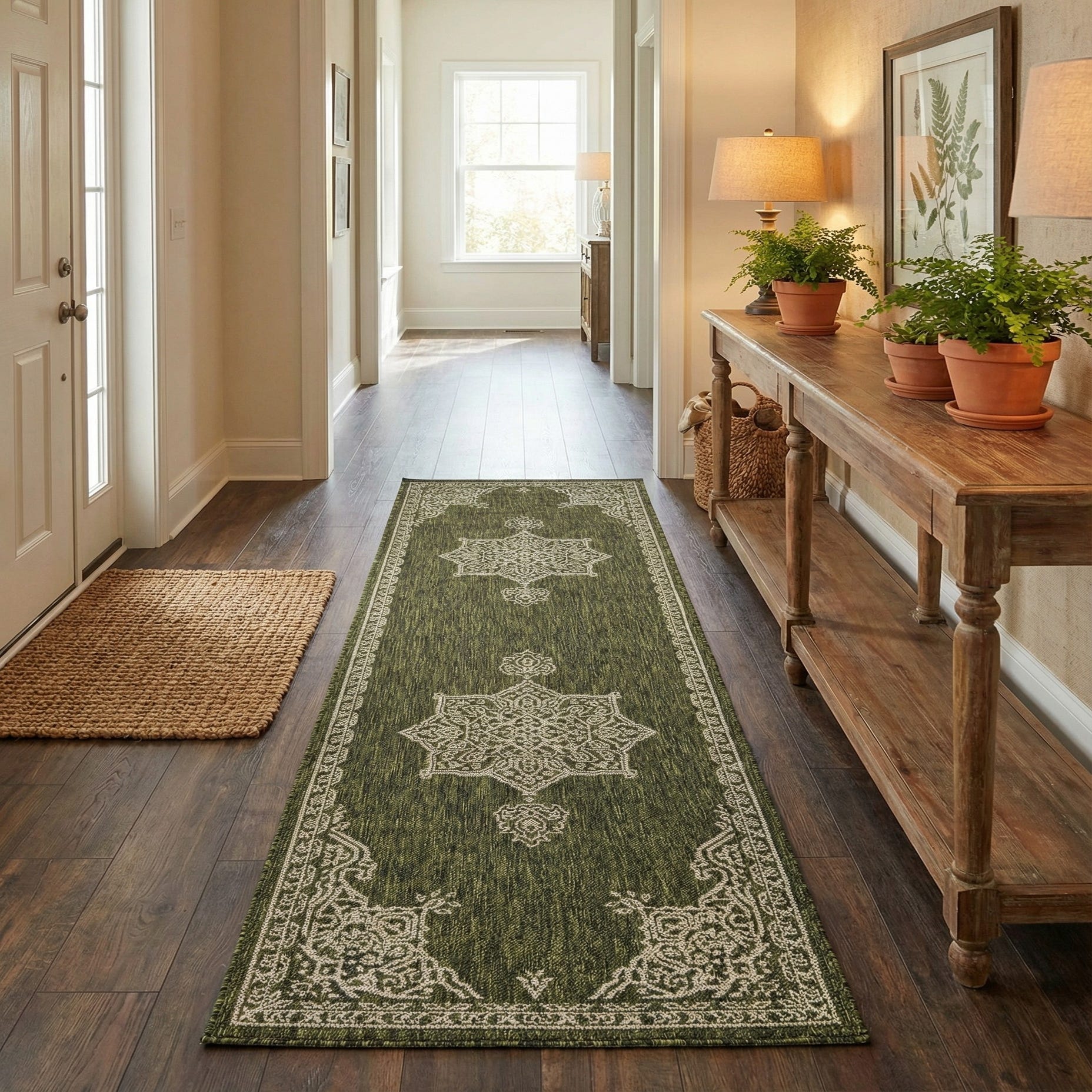 A 10 ft green runner rug with a traditional white medallion and border pattern, suitable for hallways or patios.