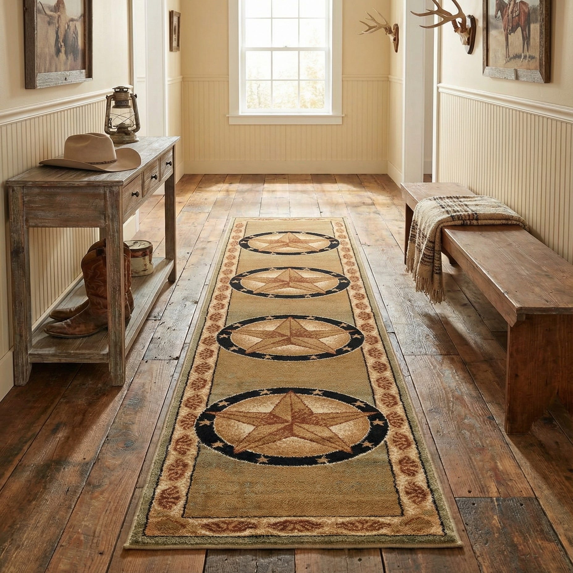 A 10 ft Pioneer runner rug in greens, featuring rustic medallion patterns with large central stars and decorative borders, ideal for hallways.