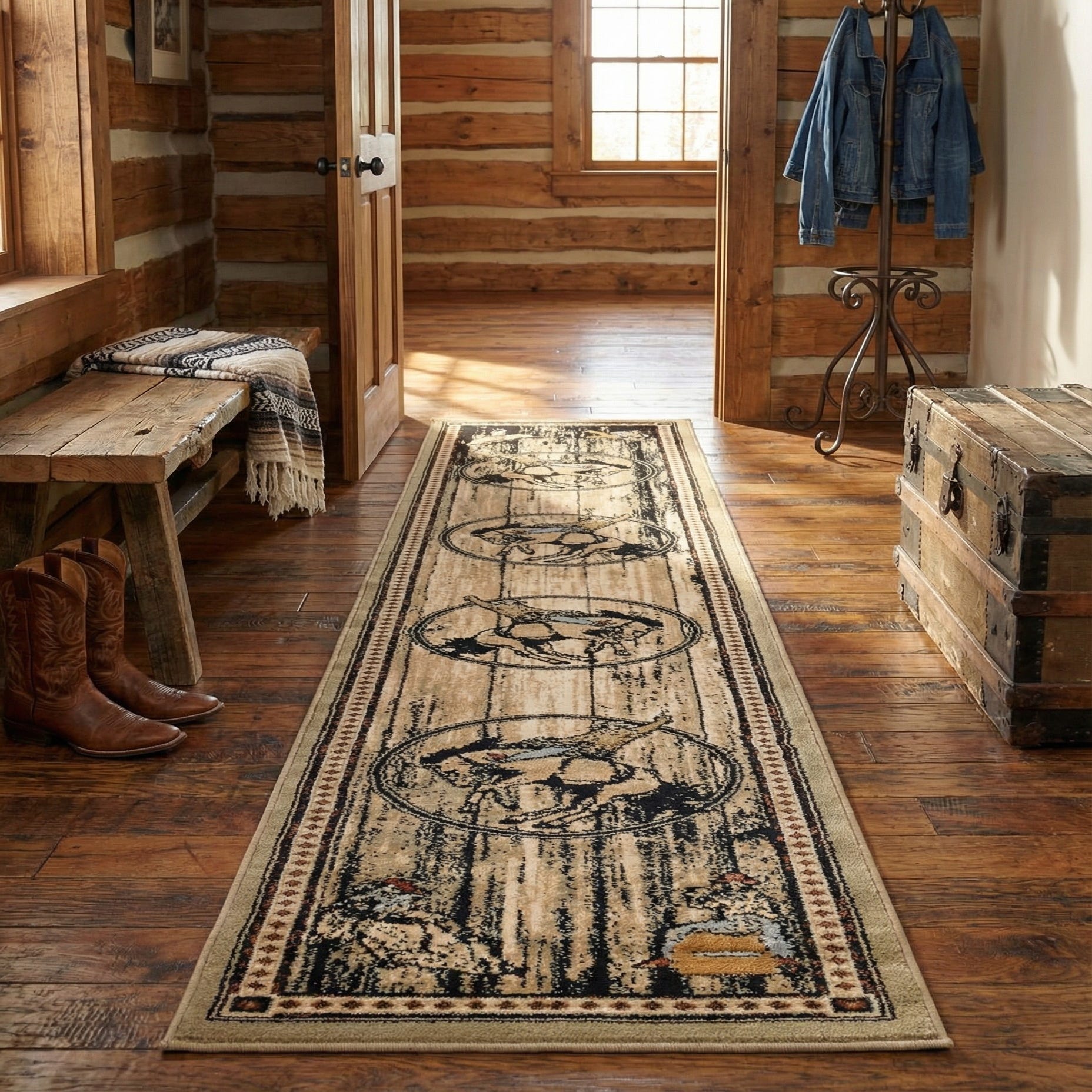 Machine-made of 100% polypropylene, the rug has a low, dense pile that feels smooth underfoot and holds clear pattern detail. Its color palette and motif work well in casual, lived-in spaces — think a farmhouse hallway, a mudroom or entry with warm wood floors, a cabin or ranch-style kitchen, or layered down a home bar or game room. Pair it with leather seating, iron or bronze accents, and natural wood tones to reinforce the Western character, or use it as a contrasting statement runner in an otherwise neutral transitional space.