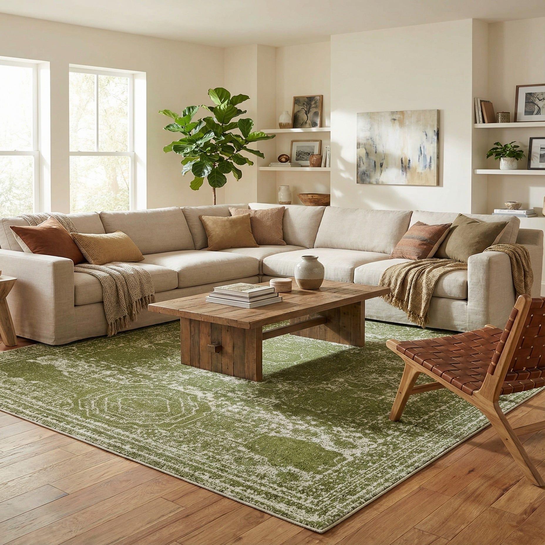 With its soothing green and ivory palette, the rug is versatile enough to enhance a variety of interior styles, including modern, transitional, and Scandinavian themes. It would harmonize elegantly with neutral furnishings, or it could serve as a contrasting pop of color against darker wood finishes or minimalist decor.