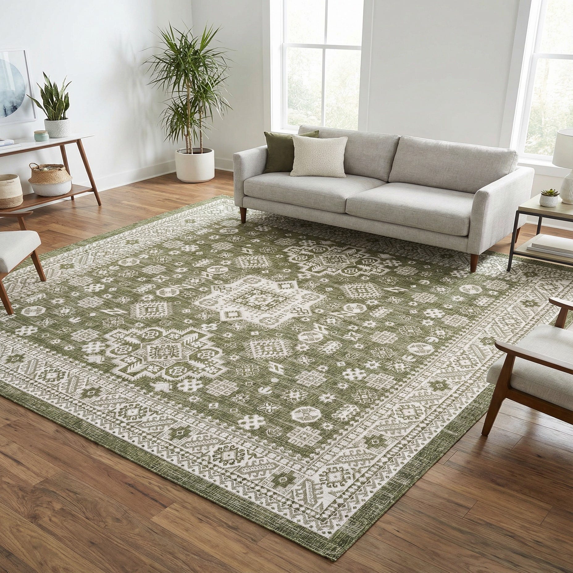 Primary color is Green. Colors in this rug include: Green, Ivory.