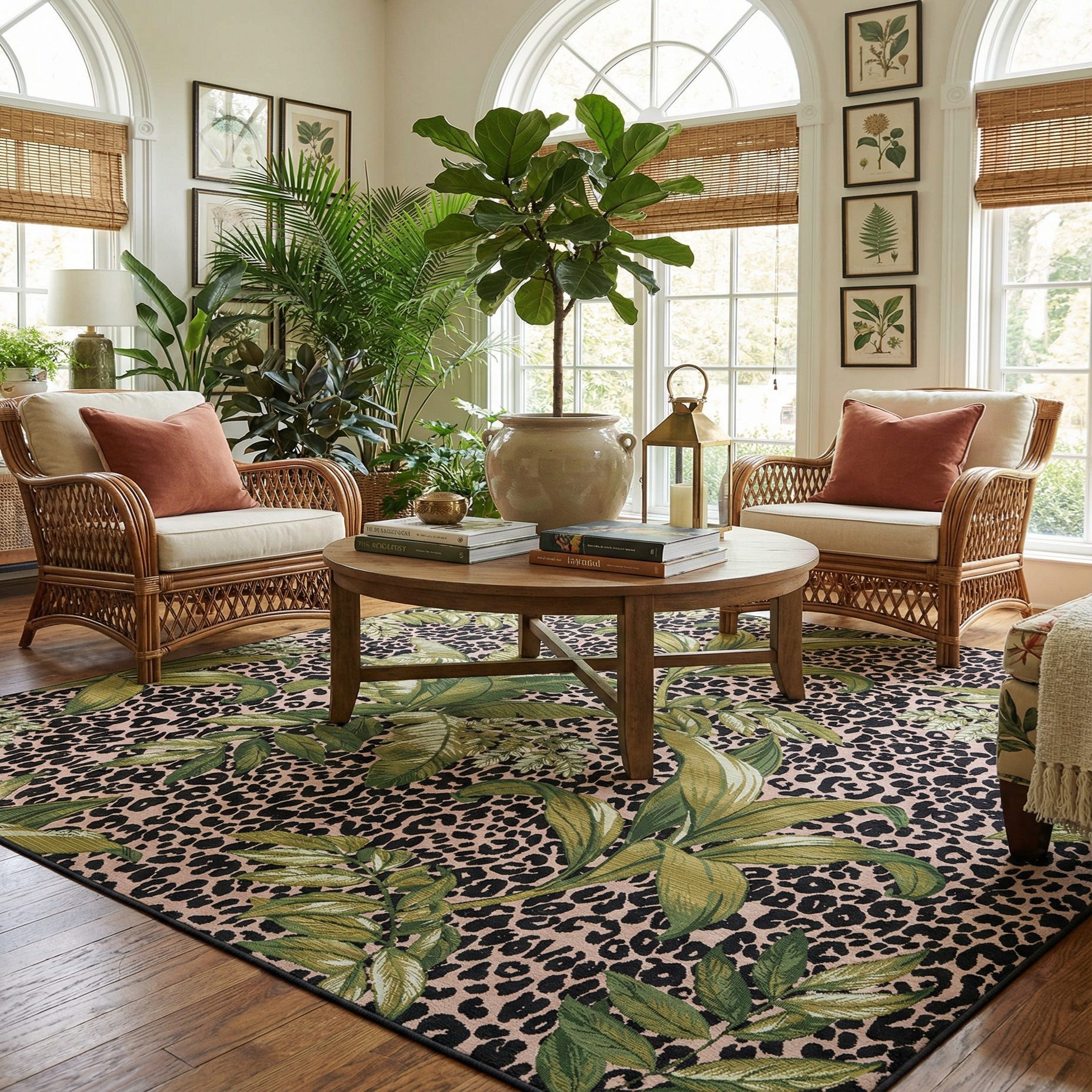 This design works well on a covered patio or screened porch when paired with natural wicker seating and neutral cushions, or in a sunroom surrounded by potted plants and wood accents. It also complements eclectic living rooms or modern spaces that benefit from a bold pattern—try it under a coffee table to ground mixed materials like leather, rattan, and brass, or use it in a dining area to introduce botanical energy without overwhelming the room.