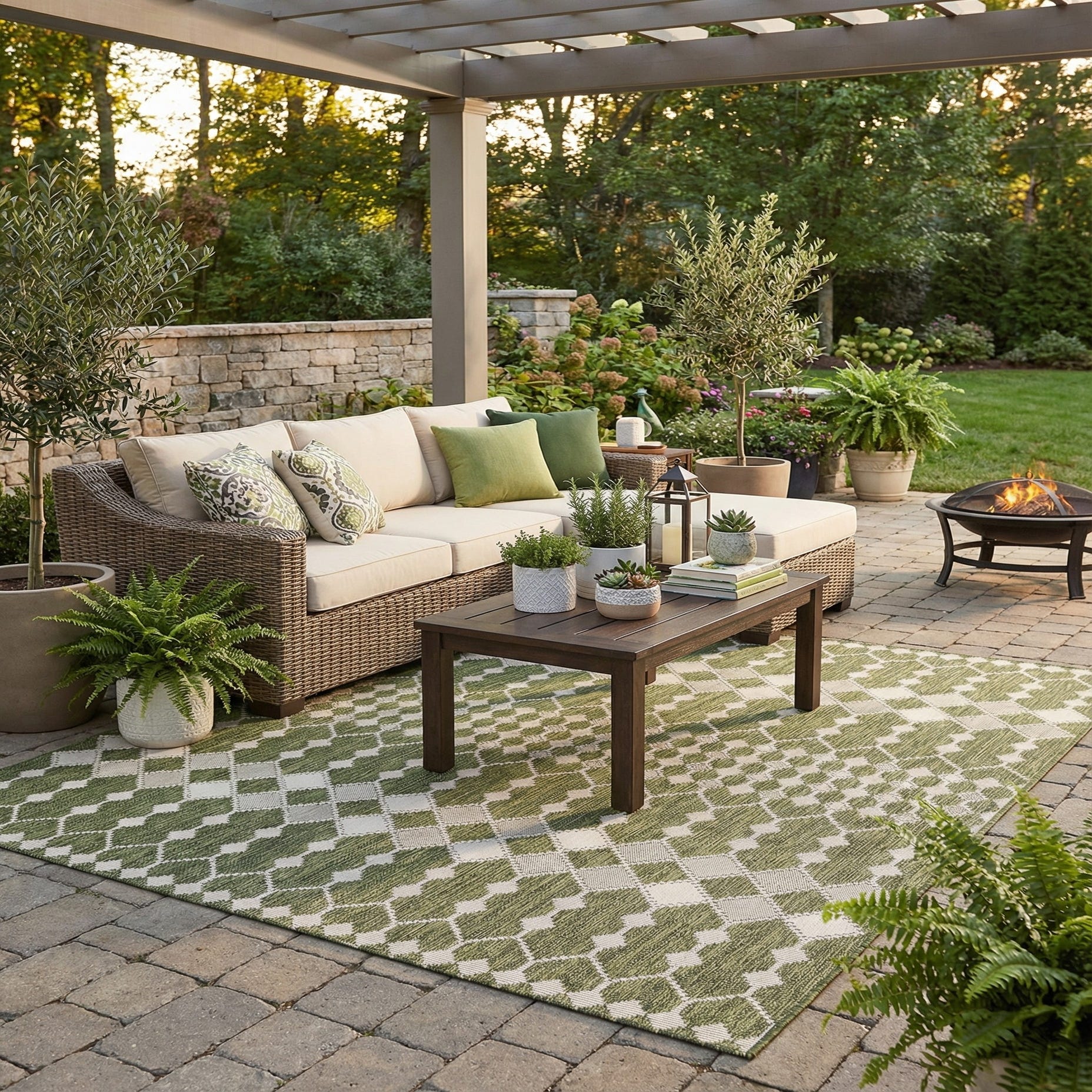 The Outdoor Lattice 10 Ft Square rug features a dynamic geometric lattice design, incorporating a harmonious blend of green and ivory hues set against a rich green background. The repeating pattern creates a visual rhythm, offering both a contemporary feel and classic touch to the piece. Its machine-woven construction from 100% polypropylene ensures durability and allows for a flatweave finish that contributes to its sleek profile.