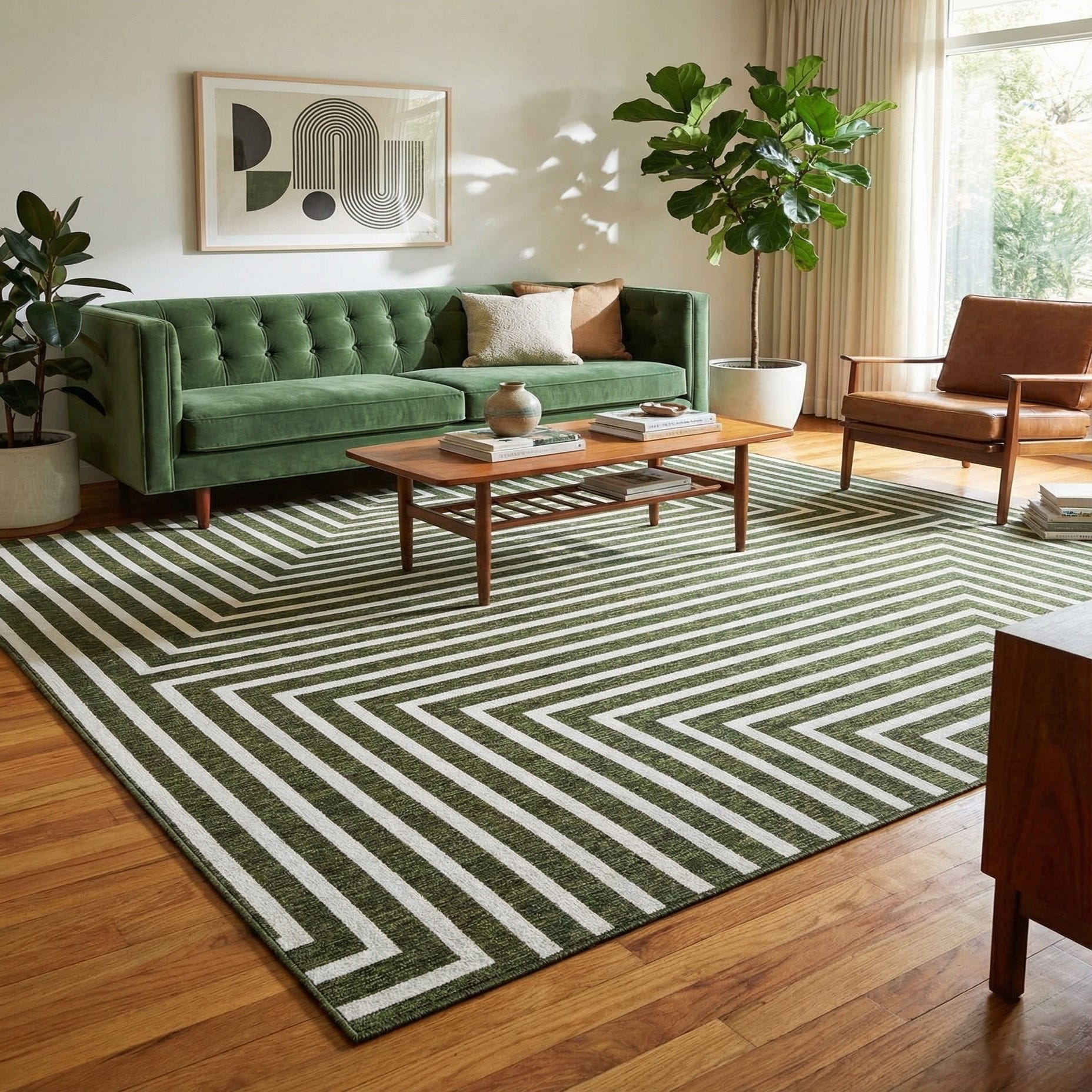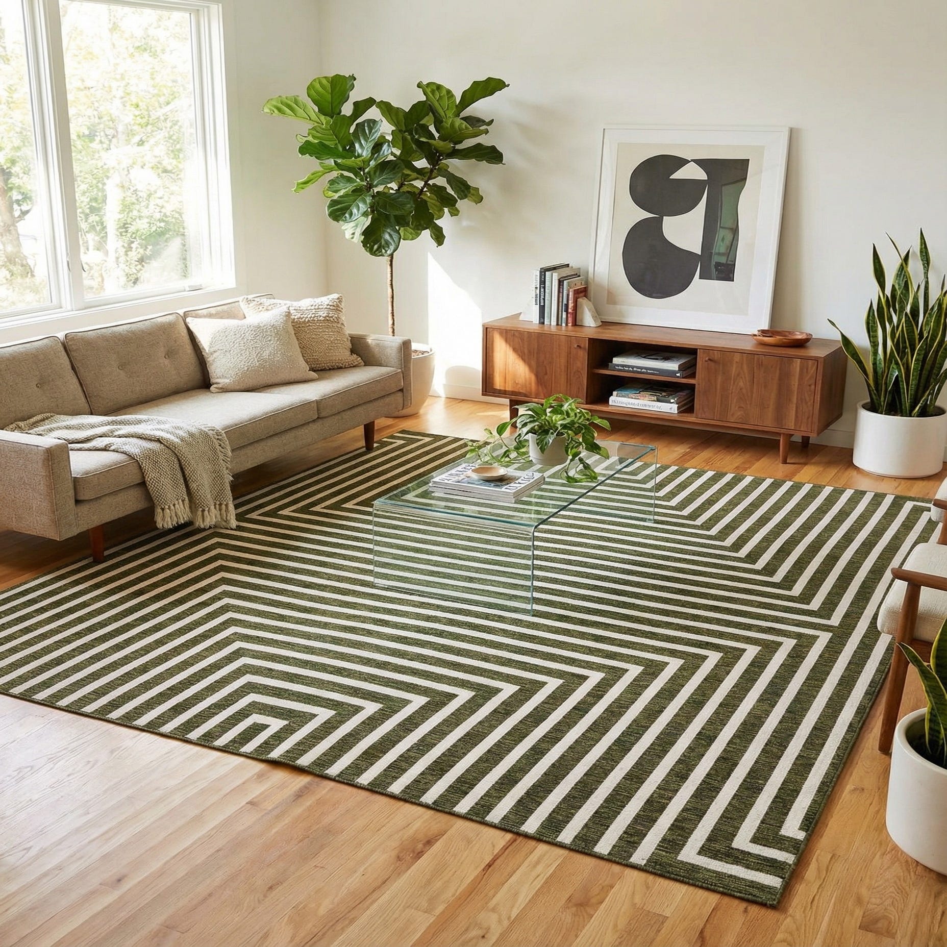 A 10'x10' square green and white modern abstract rug with a repeating geometric maze pattern, suitable for indoor or outdoor use.