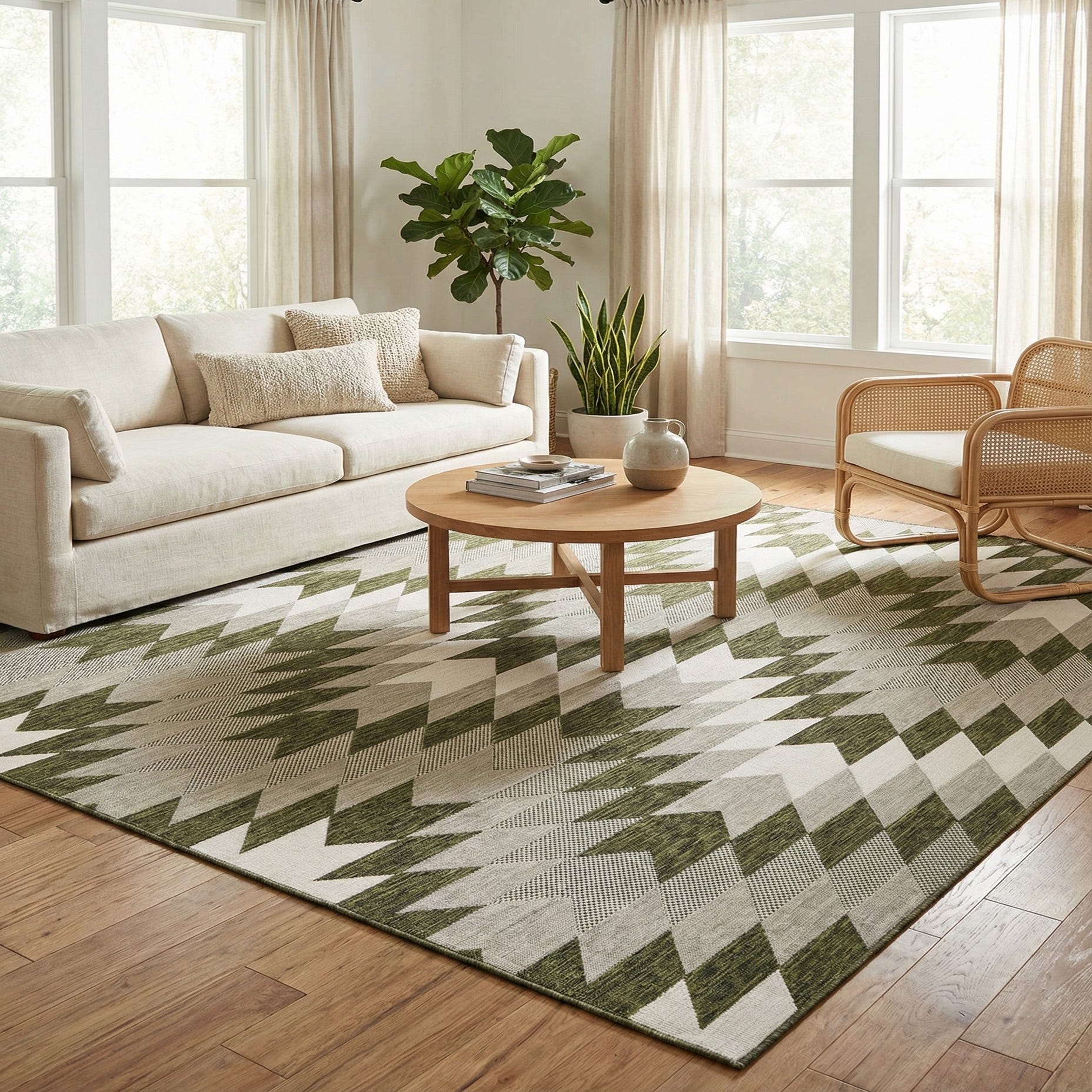 A 10'x10' square green and white tribal rug with a modern chevron and stripe pattern, suitable for indoor or outdoor use.