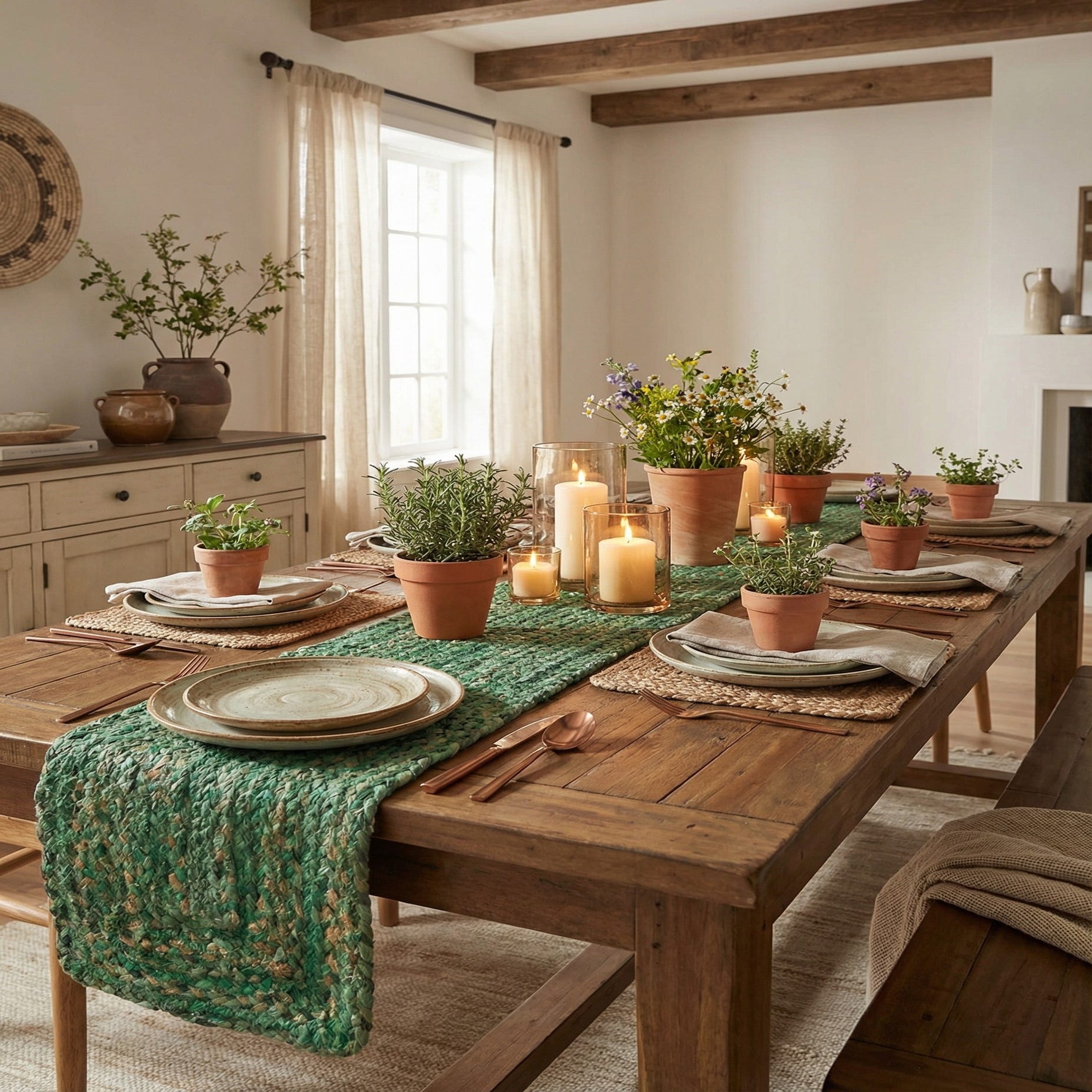 This runner works well down the center of a wood dining table, along a buffet or console, or layered over a neutral tablecloth for added warmth and texture. It complements casual, cottage, farmhouse, coastal, or bohemian schemes — pair it with natural wood furniture, woven placemats, simple linen napkins, and greenery for an inviting table, or place it on a sideboard beneath ceramic vases and brass candleholders for a relaxed, layered look.